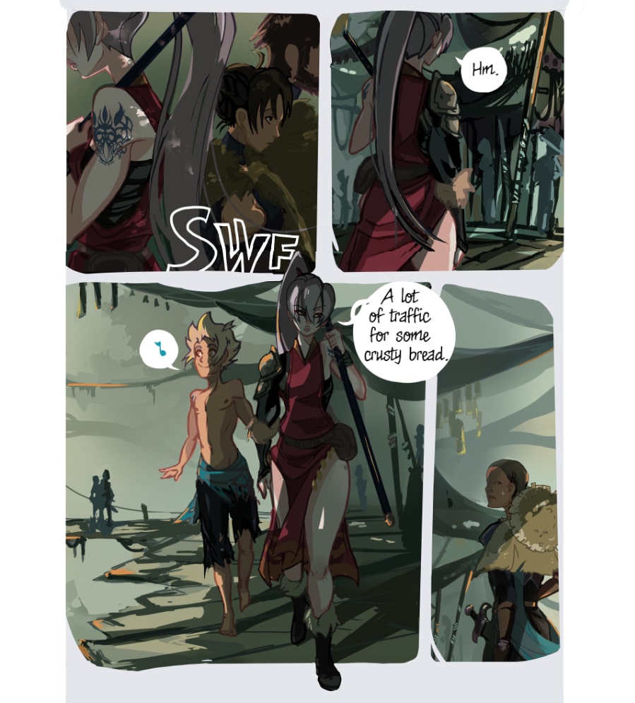 Thanks for coming back and uploading this new chapter, the backgrounds are especially lovely and that woman who looked back at our duo is mysterious... Is she a mere background character or will she have some important role to play in the story? :D