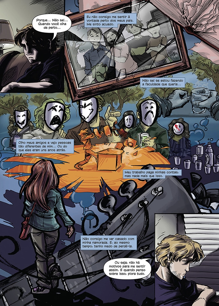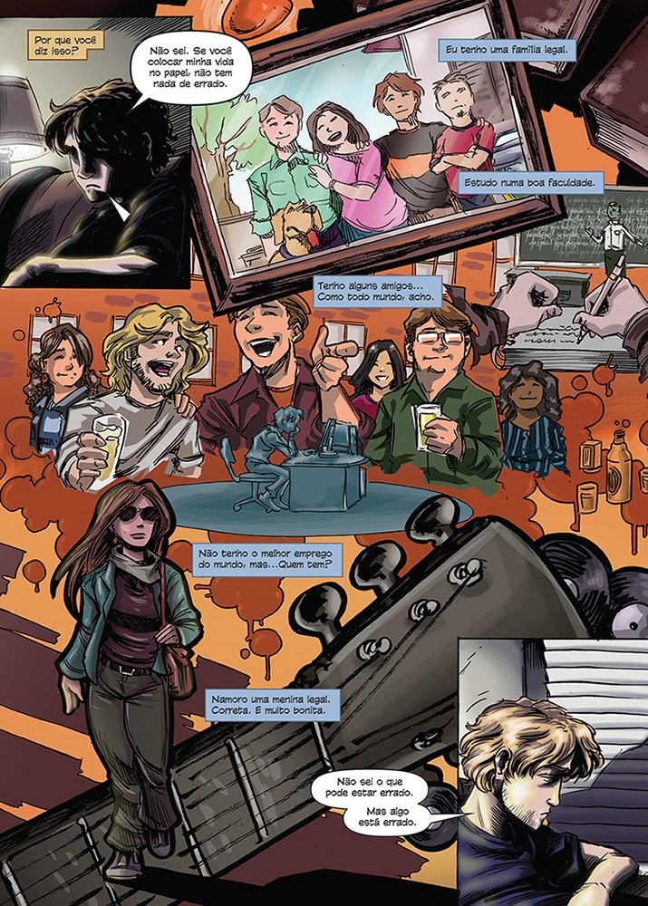 Muito legal a dicotomia expressa nas páginas entre as boas aparências da vida do rapaz e o que realmente acontece por trás. "Olho meus amigos e vejo pessoas tão diferentes de mim...ou do que eram uns anos atrás." - Essa pegou forte em mim.