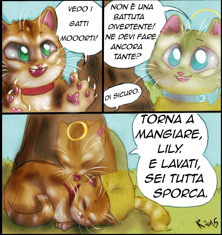 Quando Vitali è morto, Lily non l'ha visto, perché suo fratello si trovava in un ambulatorio veterinario, ma per qualche motivo, il giorno stesso della morte di Vitali, lei ha smesso di mangiare e di lavarsi. Credevamo che avesse qualche malattia, ma a parte questi due non c'erano altri sintomi e la gatta mostrava il singolare comportamento di coccolarsi con noi continuamente, cercando il nostro calore.