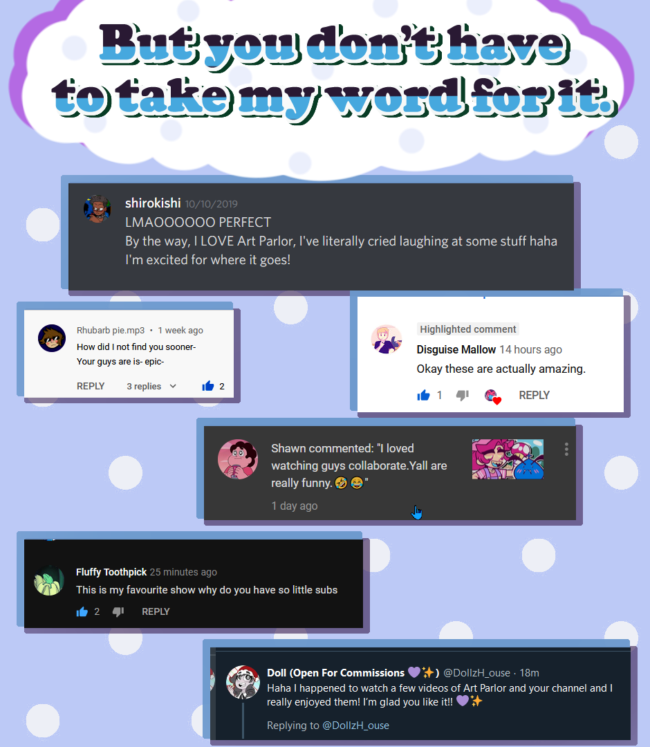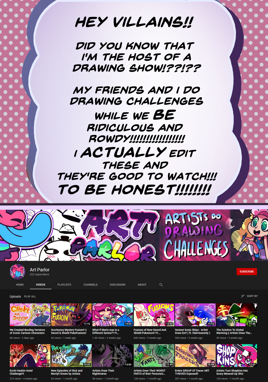 Art Parlor is fun!!! It's full of short ~10 minute drawing challenges! I spend time and edit them down, so its NOTHIN BUT NET!'