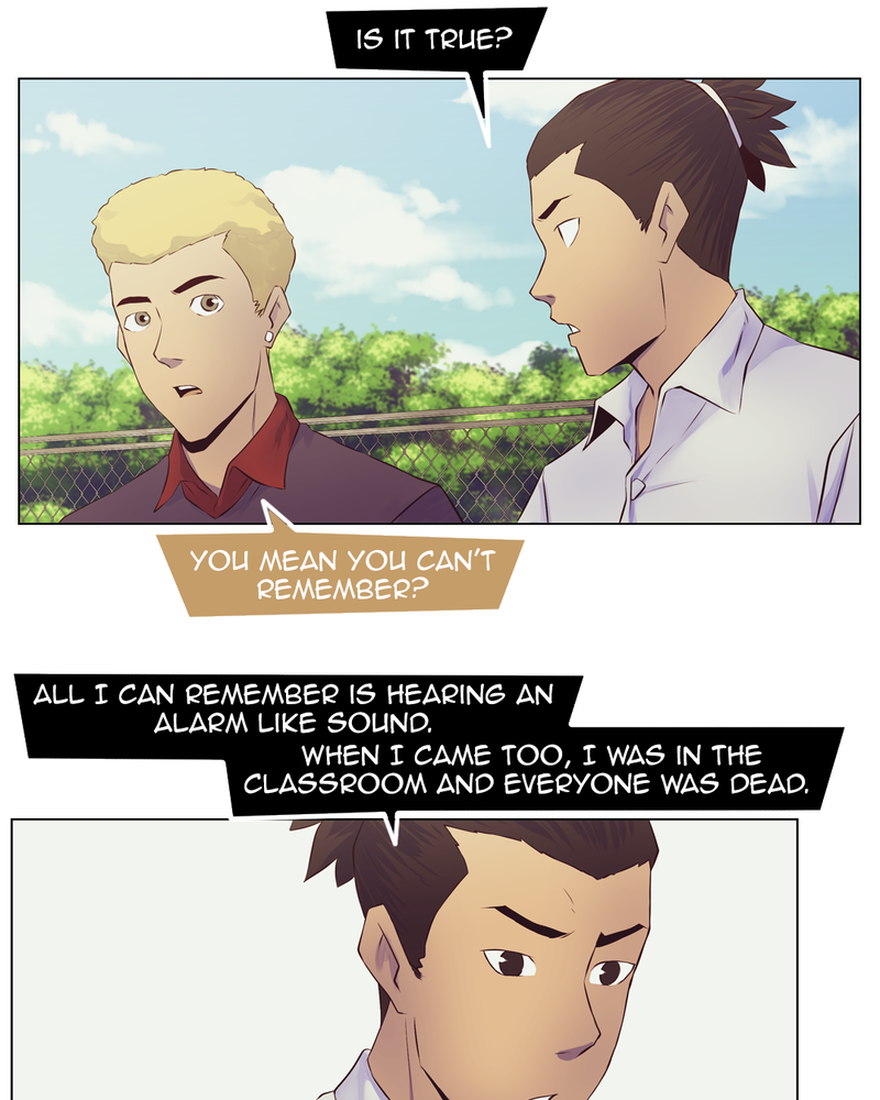 (Updates every Saturday) The Sound of the alarm triggering the lockdown is the last thing Sam can remember. Sam wakes up in the middle of his classroom to discover everyone around him is dead. With no memories of how he got there, Sam tries to figure at what could have happened, but Sam doesn't just have to worry about what killed his classmates, because even the survivors are after his blood.