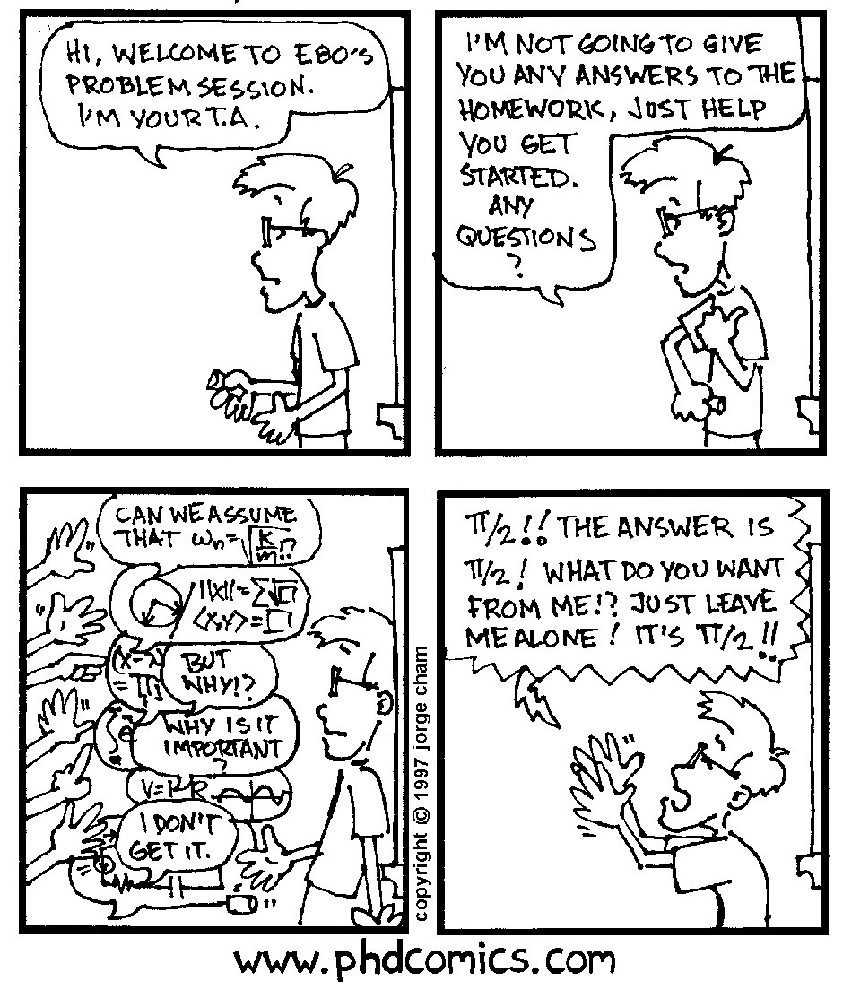 I supported myself through the first term of grad school by being a TA, and this is what it felt like. This comic started a long running theme of featuring pi/2. I did it because it seemed to me in problem sets that the answer was always conveniently something simple like that, probably because the instructor started with the answer and worked backwards to get the question.