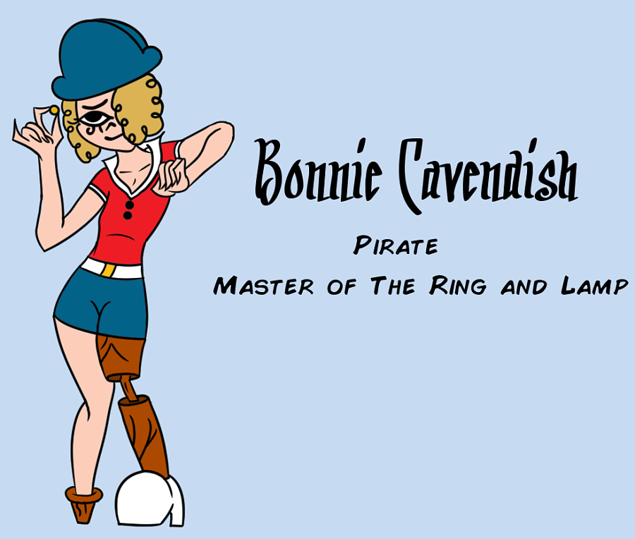 Bonnie Cavendish has wavy blonde hair. Eye of Ra tattoo on her right eye, and has a fake leg and peg foot. She is almost always over-confident and nonchalant. She has a distinct lack of empathy, power-hungry, and narcissistic. Most often she is the most dominant of any group and is quick to take over and assume control over others. She is an excellent swordsman with extravagant tastes. Her one wish was to create a groundhog day loop so she wouldn't die. A happy end for Bonnie, but she was not satisfied and wanted more.