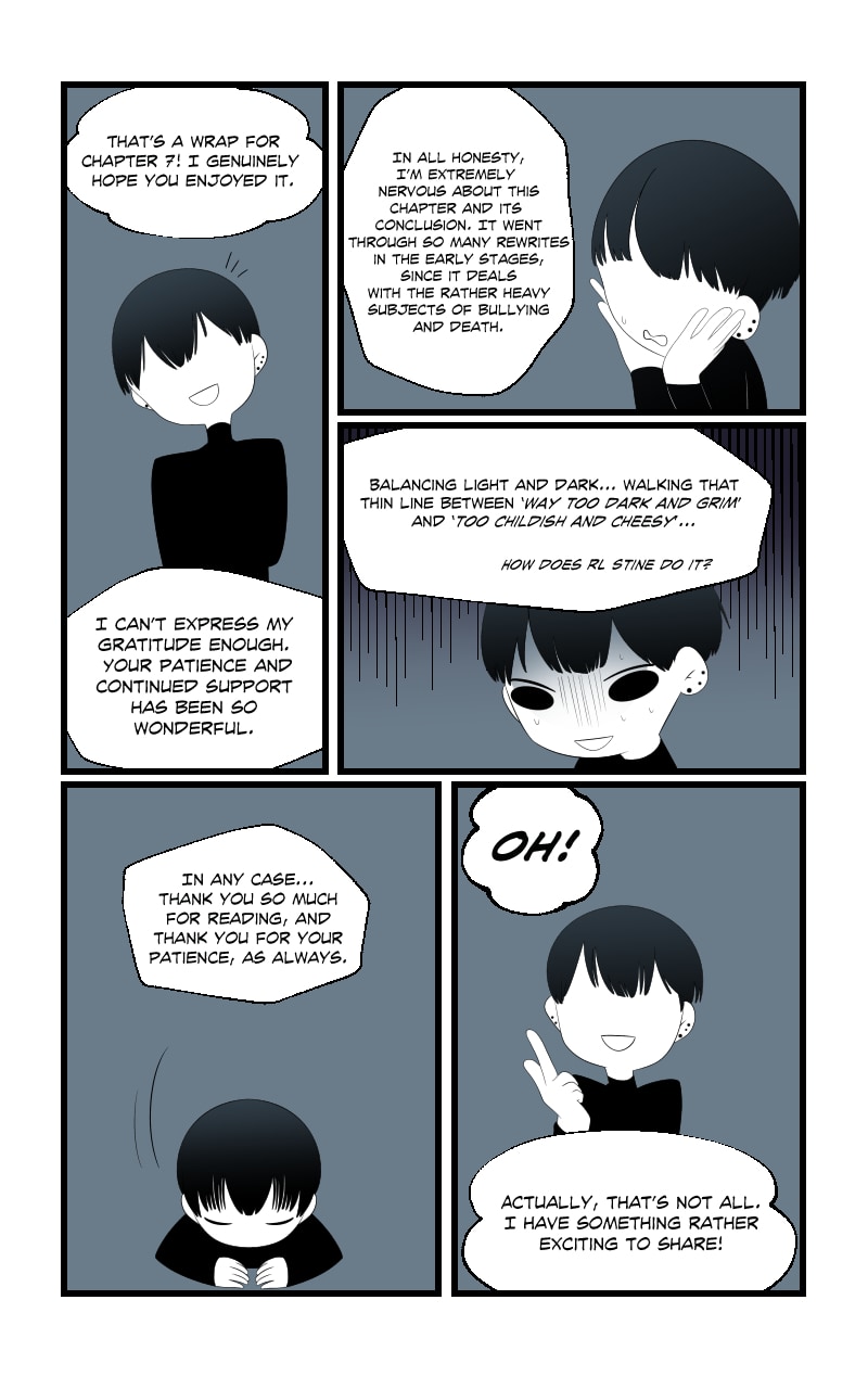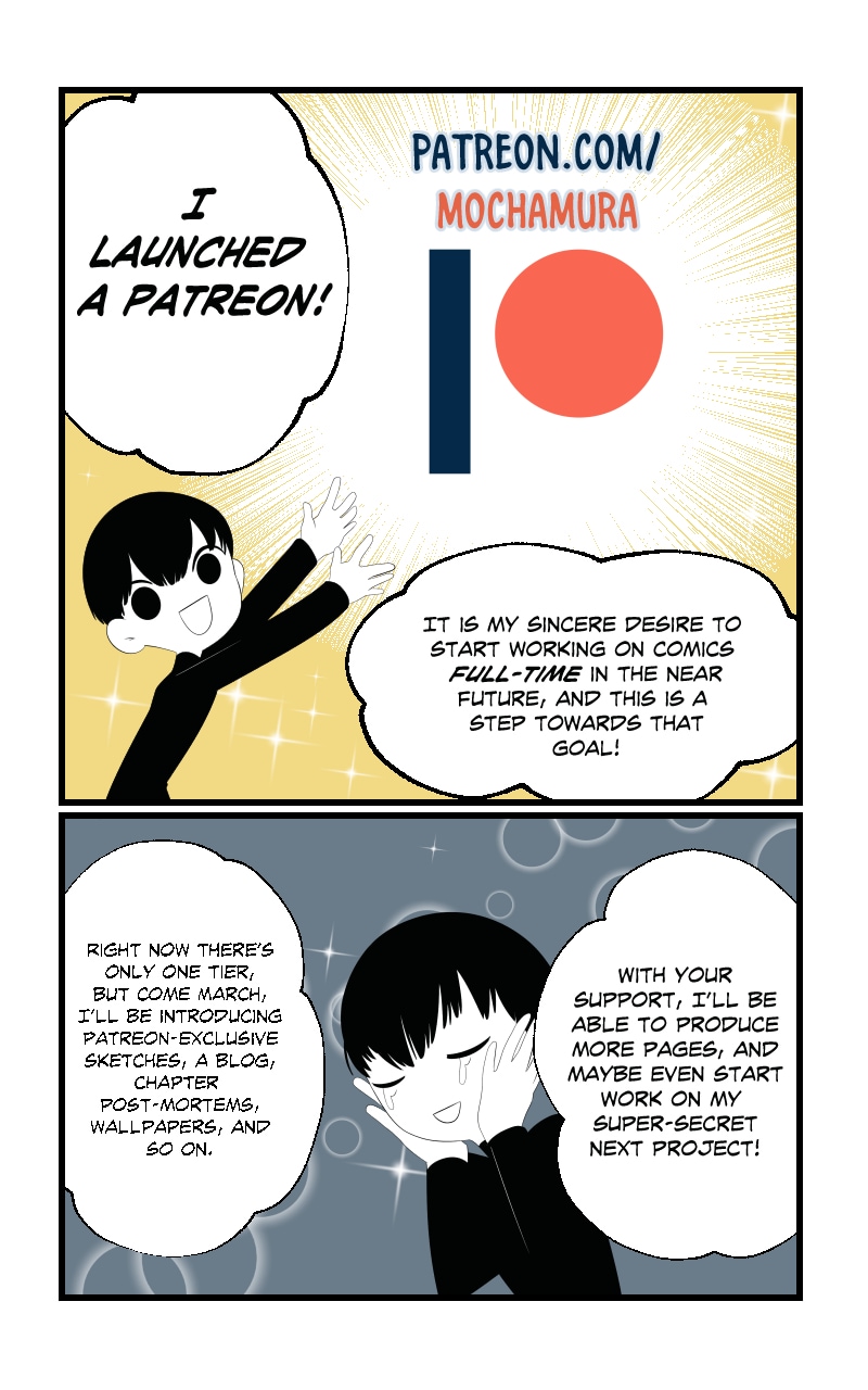Chapter 8 will be starting in just a couple weeks! If you have the means to do so and would like to start supporting me in my goal of going full-time with my comics, please considering pledging at patreon.com/mochamura!
