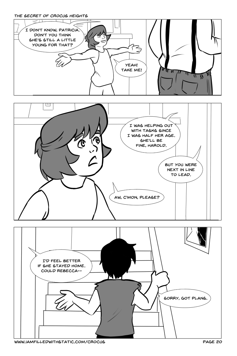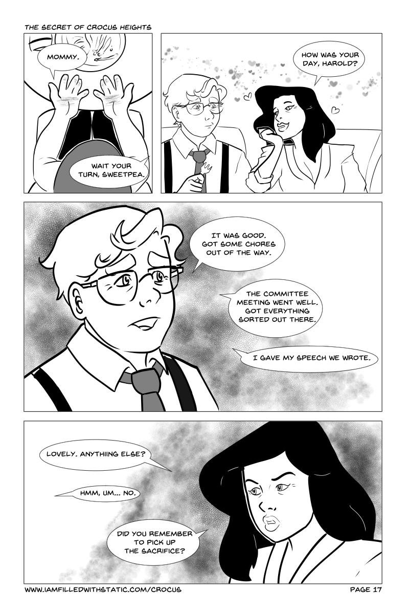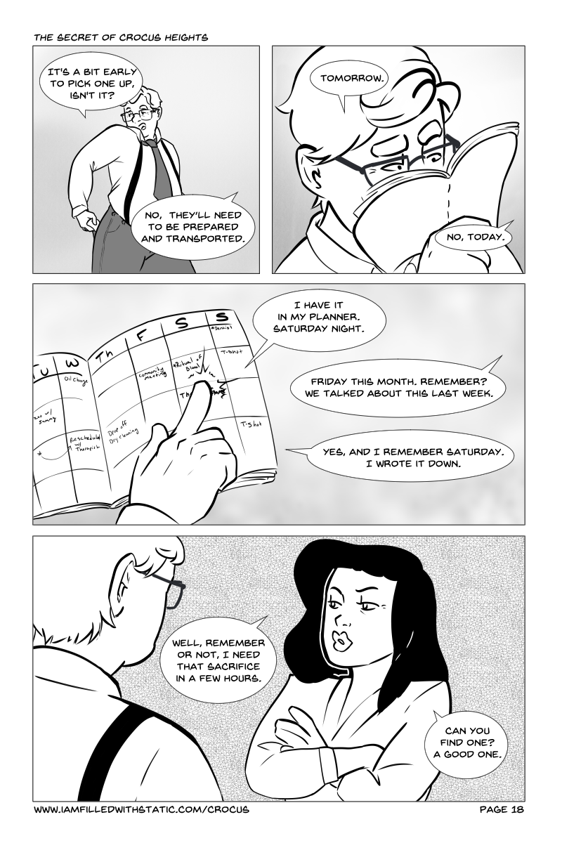 "The Secret of Crocus Heights" will guide you through the daily lives of some upstanding members of the community of Crocus Heights, and drag you through the horrifying mess that unfolds. Follow the paths of several characters dealing with quickly worsening circumstances brought on when Alayna finds an ominous curio while playing in the woods.