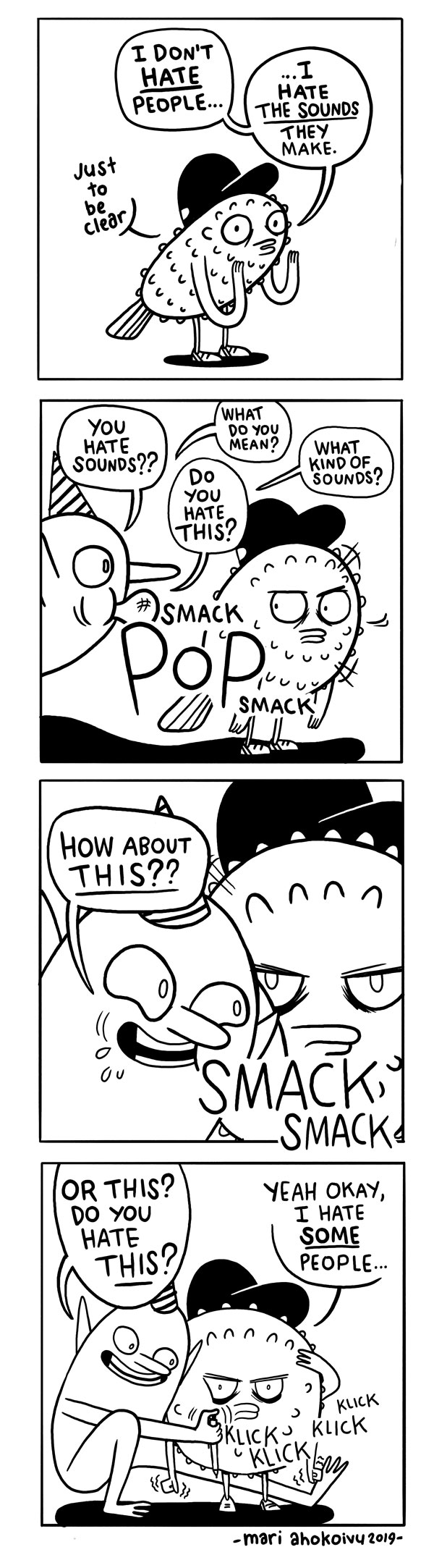 Sound OFF is a webcomic created by Mari Ahokoivu. It follows the life of a little puffer fish who suffers from misophonia, also known as "hatred of sound”.