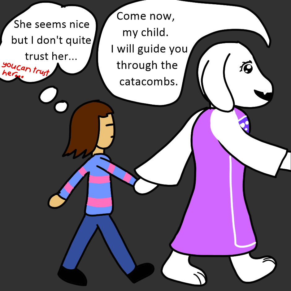 I just realised that I forgot to draw Toriel's horns in the last panel. Not surprised, though. It's quite difficult for me to draw her, since I have very little experience in drawing anthropomorphic animals.