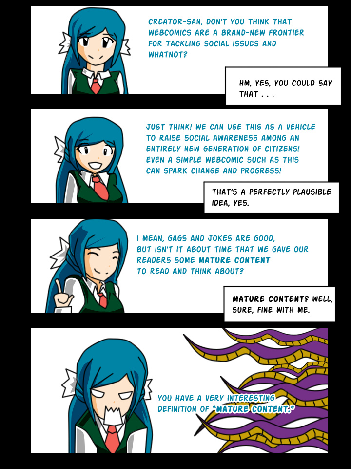 Are you looking for funny jokes, intelligent writing, and overall substance? If so, off to the next comic you go! But if you're in for some stupid puns, existential horror, and gratuitous fanservice, then we welcome you into Kurumi's crazy life, saving the world one stupid joke at a time!
