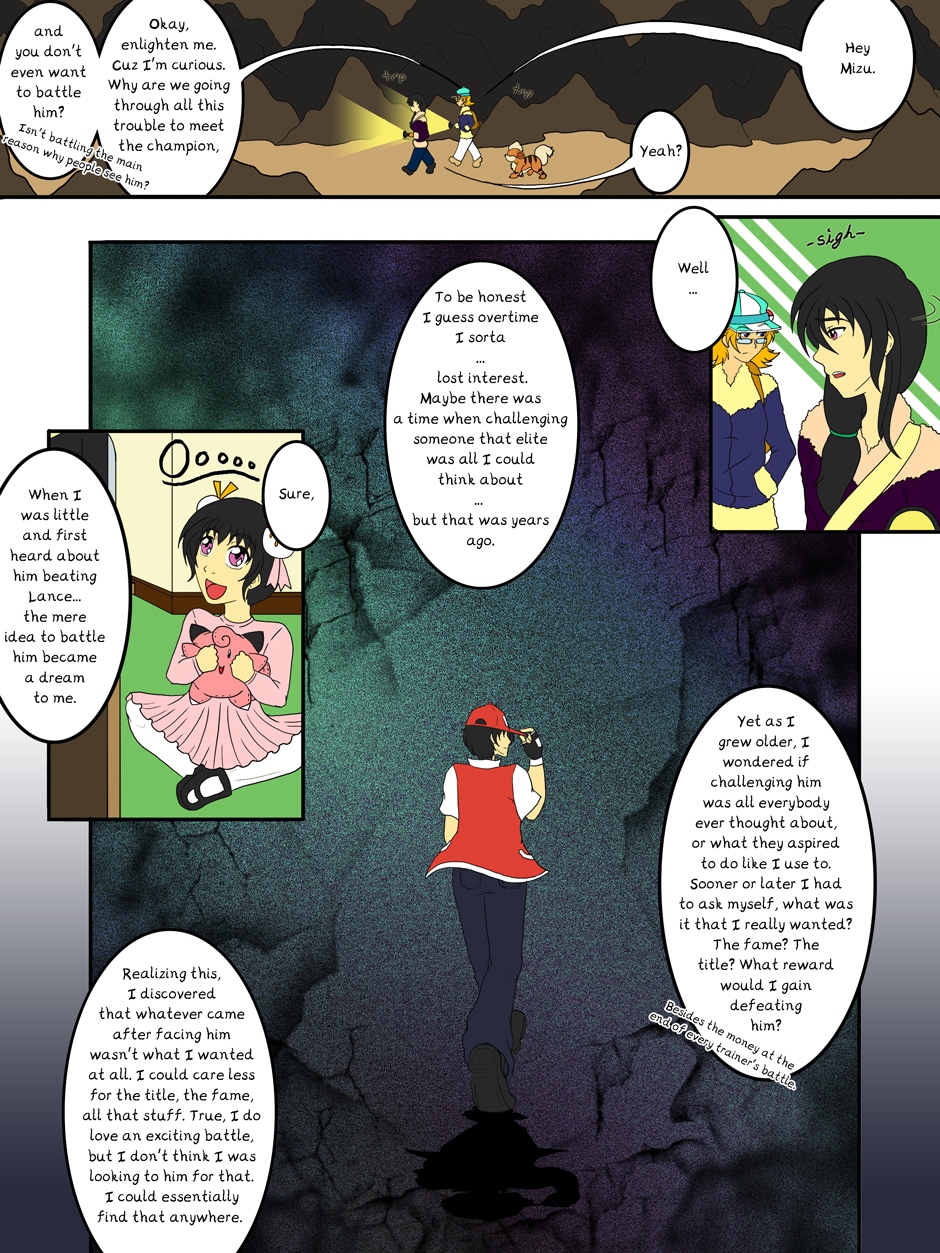 [[Reads right to left!]] Mizu, a girl from New Bark Town didn't start her Pokemon journey until she was 16, and three years since then, she and her new friend, Kissa, head to Mt. Silver. There, she meets Kanto and Johto champion Red, and challenges him. Through a tough battle, she unknowingly impacted the world champion and is about to embark on another adventure with new additions to the party! Question is, is it possible for someone like Mizu to help Red discover what he's searching for?