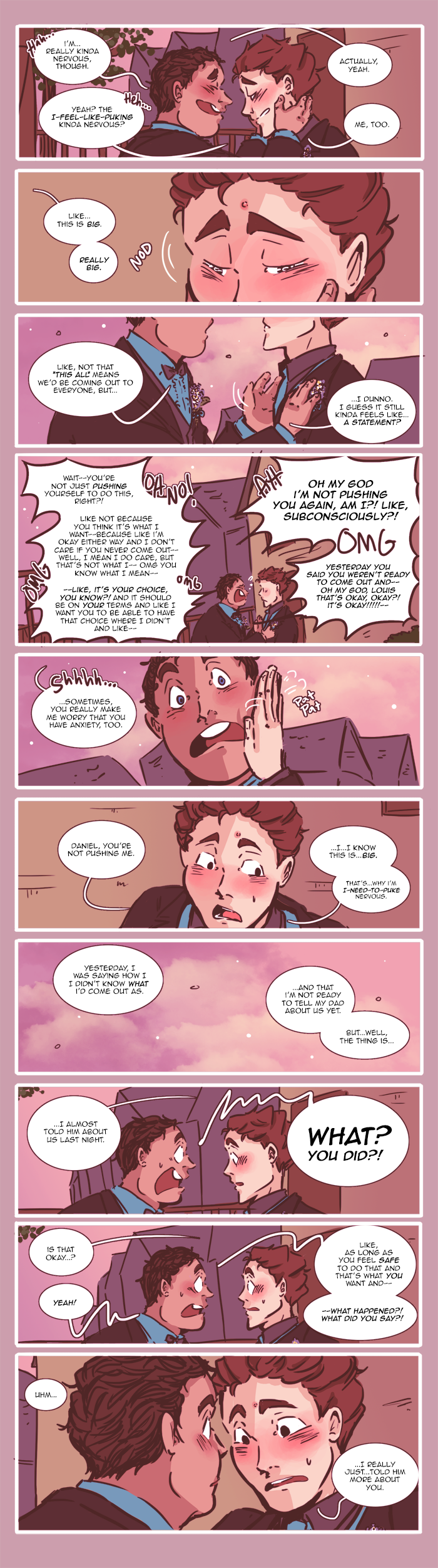 Content warnings: profanity, innuendos and characters talking about sex, some references to underage drinking, discussion of bullying/self-harm/substance abuse/alcoholism/mental illness, and the graphic representation of anxiety/panic attacks. Other topics include death, emotional/verbal abuse, and therapy.