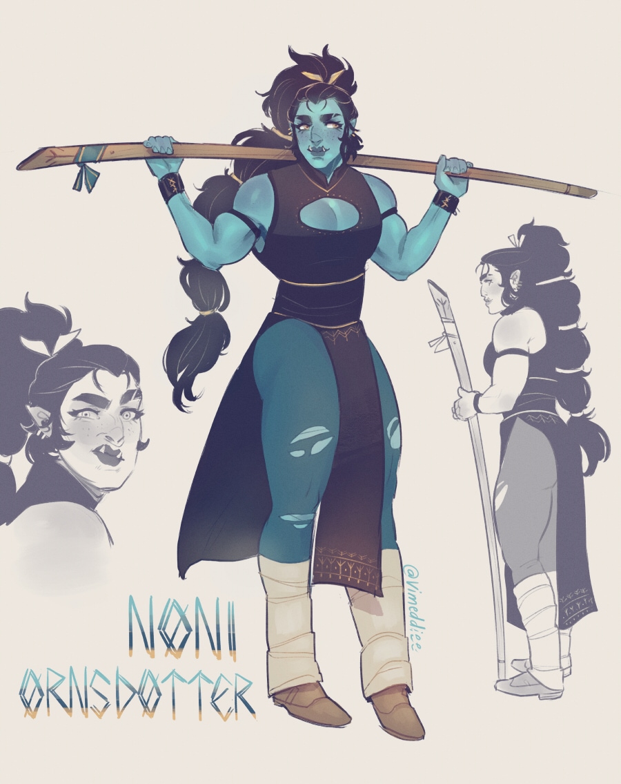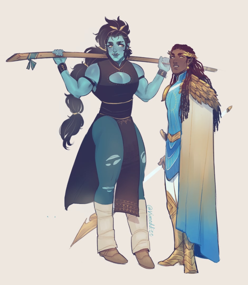 I JUST NOTICED I HADN'T SHARED THESE YET WHOOPS Noni (half-orc monk): ✨ She/her ✨ 29 years old ✨ 6'1" ✨ Neutral good ✨ Pansexual✨ Apolion Omeneiris (sun elf fighter): ✨ He/him ✨ 30 human years old ✨ 5'9" ✨ Bi-curious (prefers ladies) ✨ Neutral ✨ handsome but DENSE