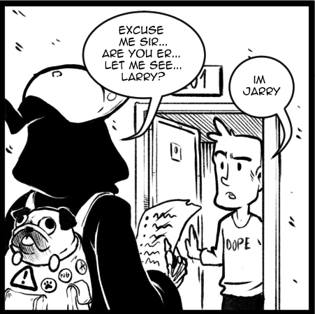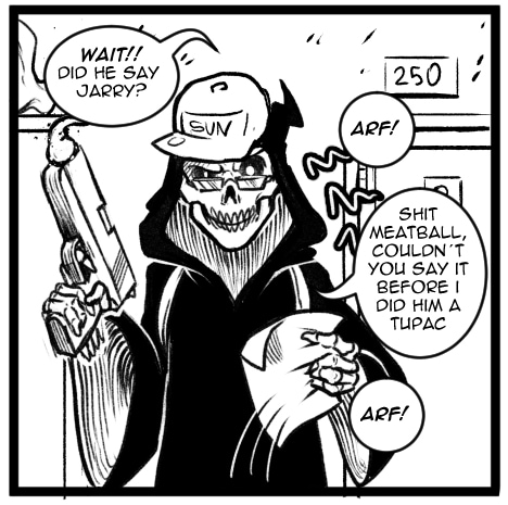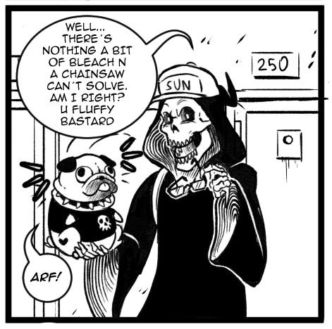we all have little confussions at work, Death is no exception, at least he has Meatball to help
