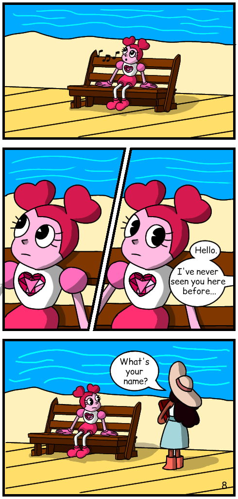 Spinel is trying to think what to do next on her mission to find Pink but she meets her first human friend.