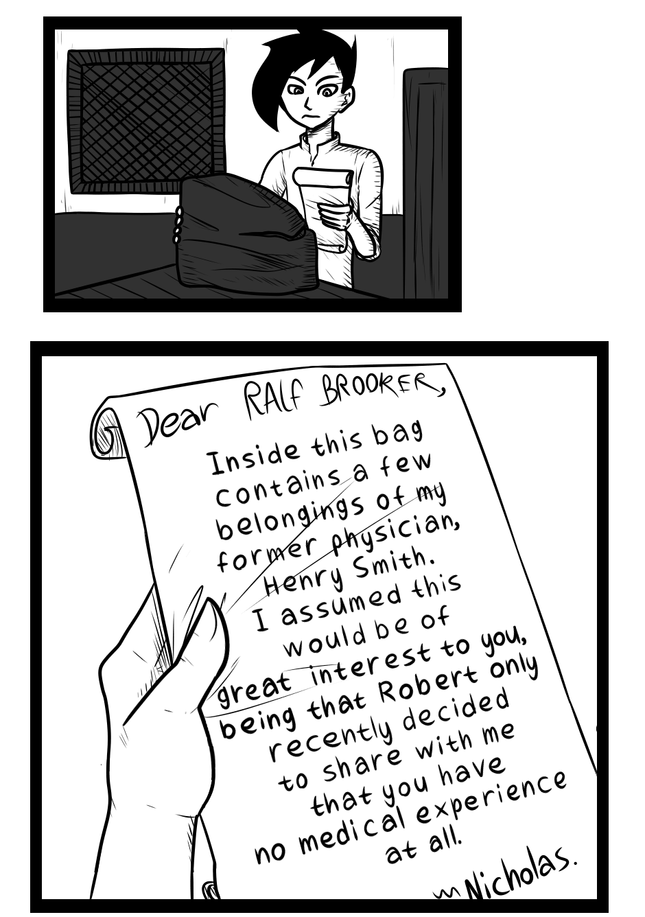 Ralf Brooker gets an unexpected delivery to his home, a bag containing the belongings of Mayor Nicholas' former physician...