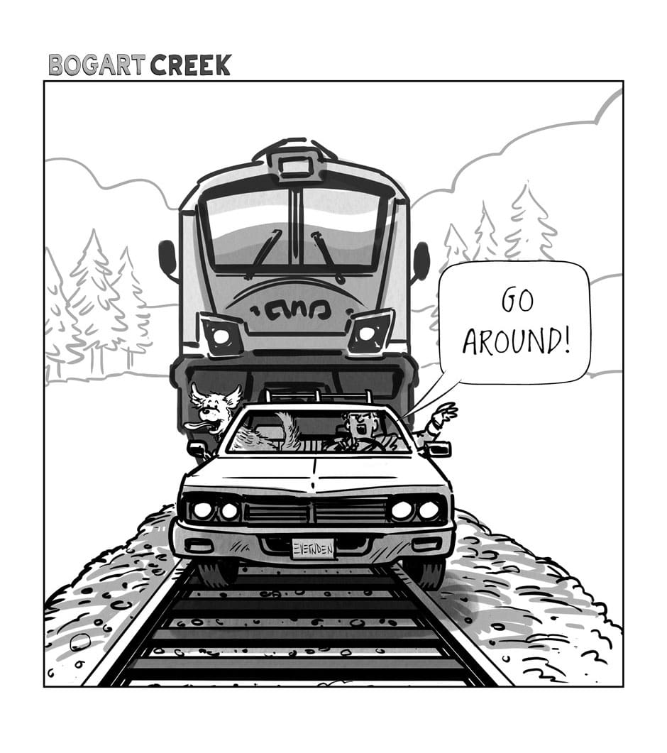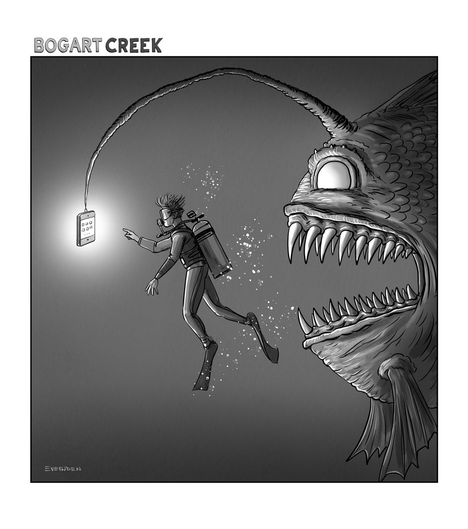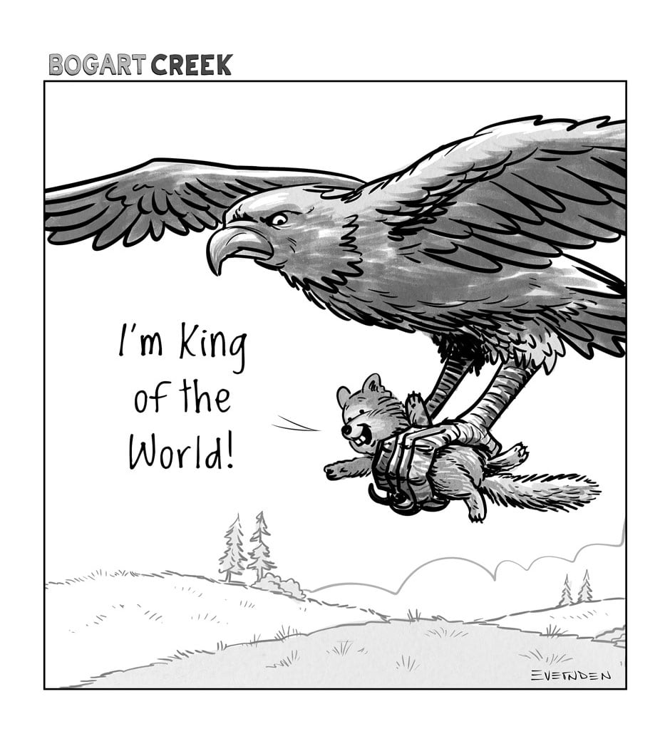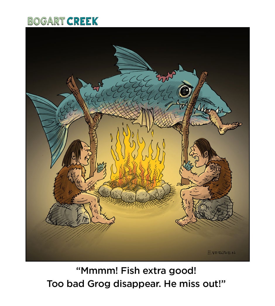 In the last panel, the subtitles felt a little redundant. I didn't need to read them to know Grog disappeared; I could see his leg sticking out of the fish's mouth while the other cavemen were oblivious to the whole thing, irony and all.