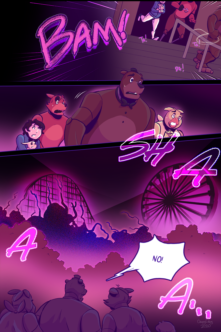 Inside this building, four animatronics, possessed but no longer overwhelmed by the ghosts from their past,