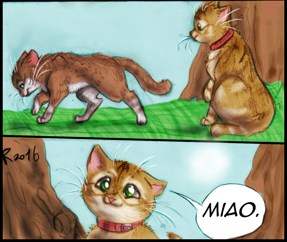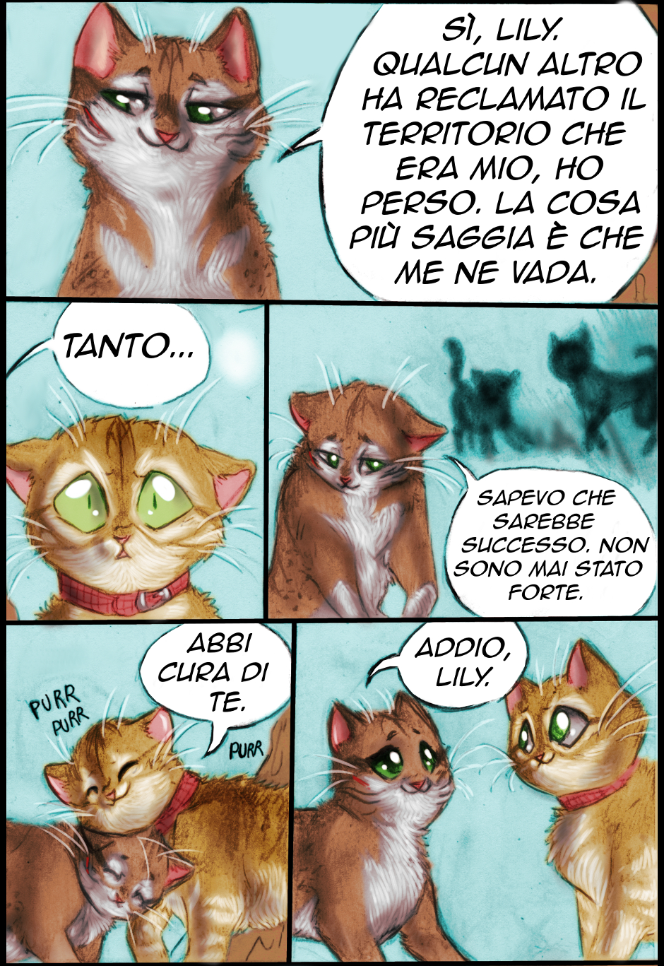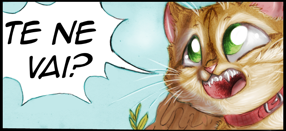 E diciamo "ciao ciao" ad un personaggio che abbiamo accolto nella strip 19, Gatto , che dopo l'arrivo di Adone (conoscerete anche lui presto) se n'è andato e anche ora che sono passati alcuni mesi ancora non l'abbiamo rivisto. È chiaro cosa è accaduto: prestante e grosso, Adone ha facilmente avuto ragione di un gatto più piccolo di lui (e Gatto è persino più minuto di Lily, che è una femmina) e ne ha preso il territorio.