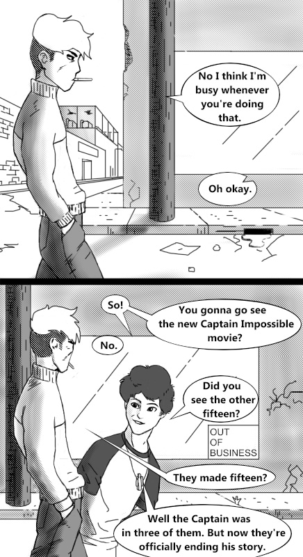 Retired sidekick Kyden is now living a normal life. He buys his groceries and pays his bills. But what happened to the capes, the faith in the heroes, and the pursuit of justice? And what happened to Kid Flare and his mentor, the indestructible beacon of justice, Captain Impossible? Together they defended the city from the worst villains. But what happens when the villains suddenly become the heroes and the heroes stop saving the day?