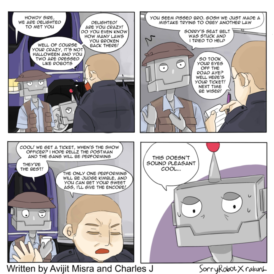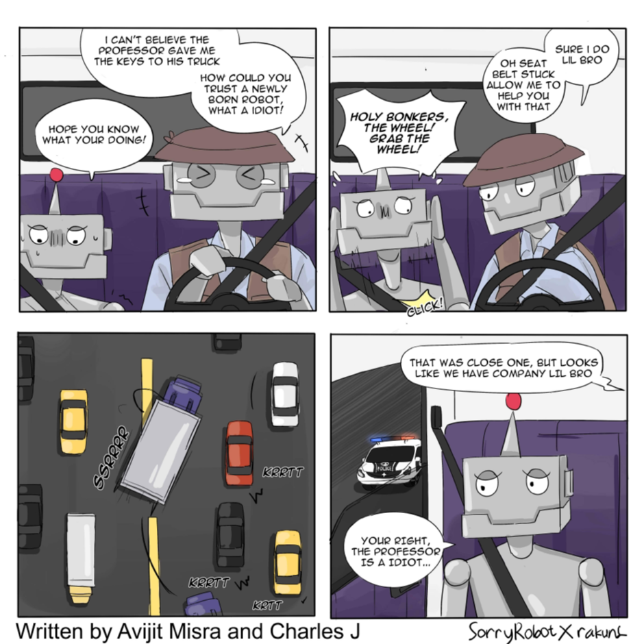 Flyah Comics presents Robots Adventure, which is a story starring the Sorry and Cool Robots who were created by the evil Professor Willy. The robots display human nature, and both the introverted and extroverted personalities. With cool being the out going Robot and Sorry being the innocent one, this story is action packed and hilarious at the same time!