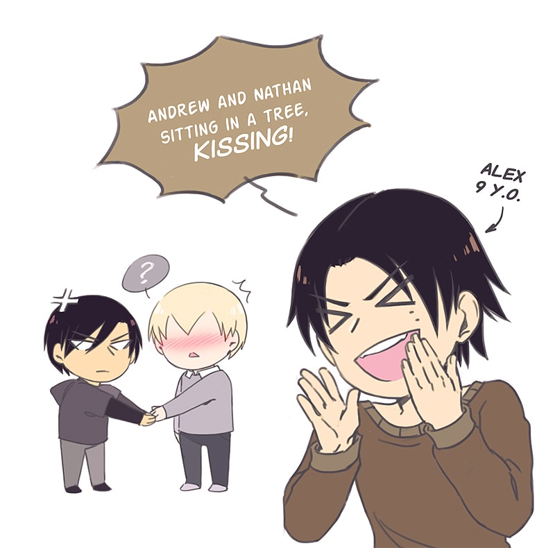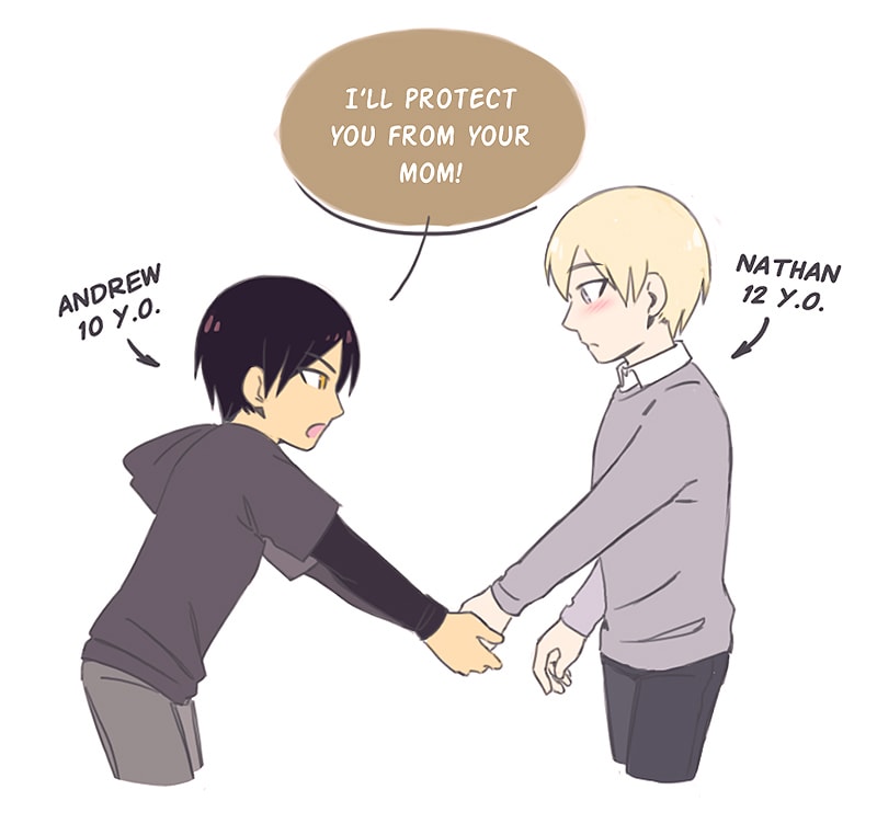 Same nerds but 8 years younger (Andrew being more assertive as a kid, while Nathan timid) suggested by Mossy.-.Legends (*゚▽゚*)
