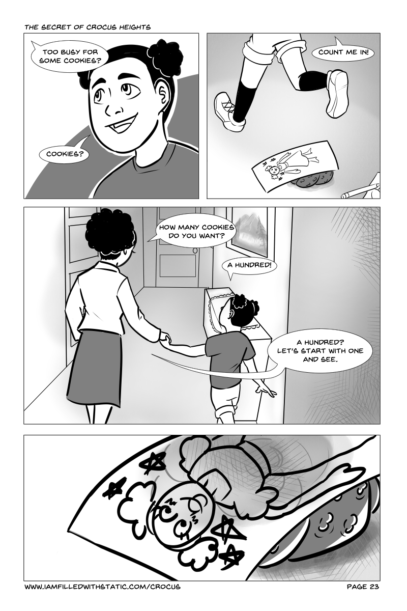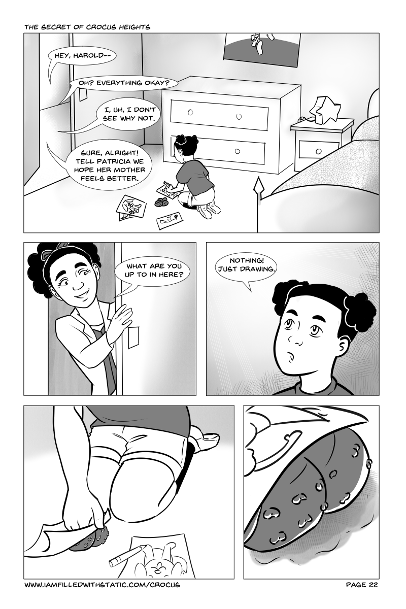 "The Secret of Crocus Heights" will guide you through the daily lives of some upstanding members of the community of Crocus Heights, and drag you through the horrifying mess that unfolds. Follow the paths of several characters dealing with quickly worsening circumstances brought on when Alayna finds an ominous curio while playing in the woods.