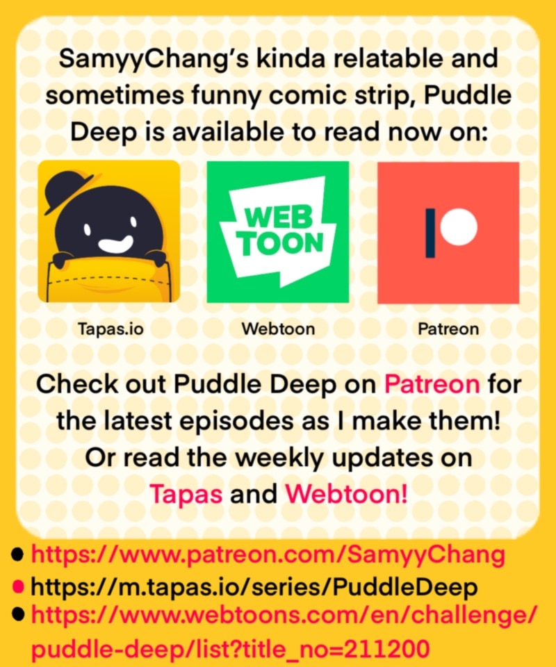 I made this before the whole pandemic thing and I’m not sure it holds up. Follow @PuddleDeep on Instagram! ————— Links: -Patreon: www.patreon.com/SamyyChang -Tapas: tapas.io/series/PuddleDeep -Webtoon: www.webtoons.com/en/challenge/puddle-deep/list?title_no=211200