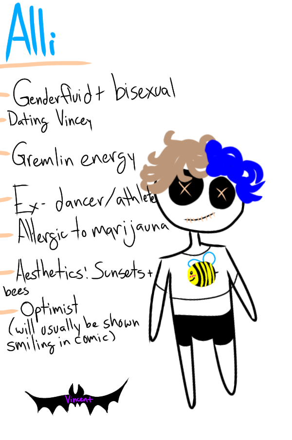 Alli's design is subject to change, but these are the 3 main characters of this comic. Alli won't be too frequent, considering the person they're modelled after doesn't live nearby enough to see frequently.