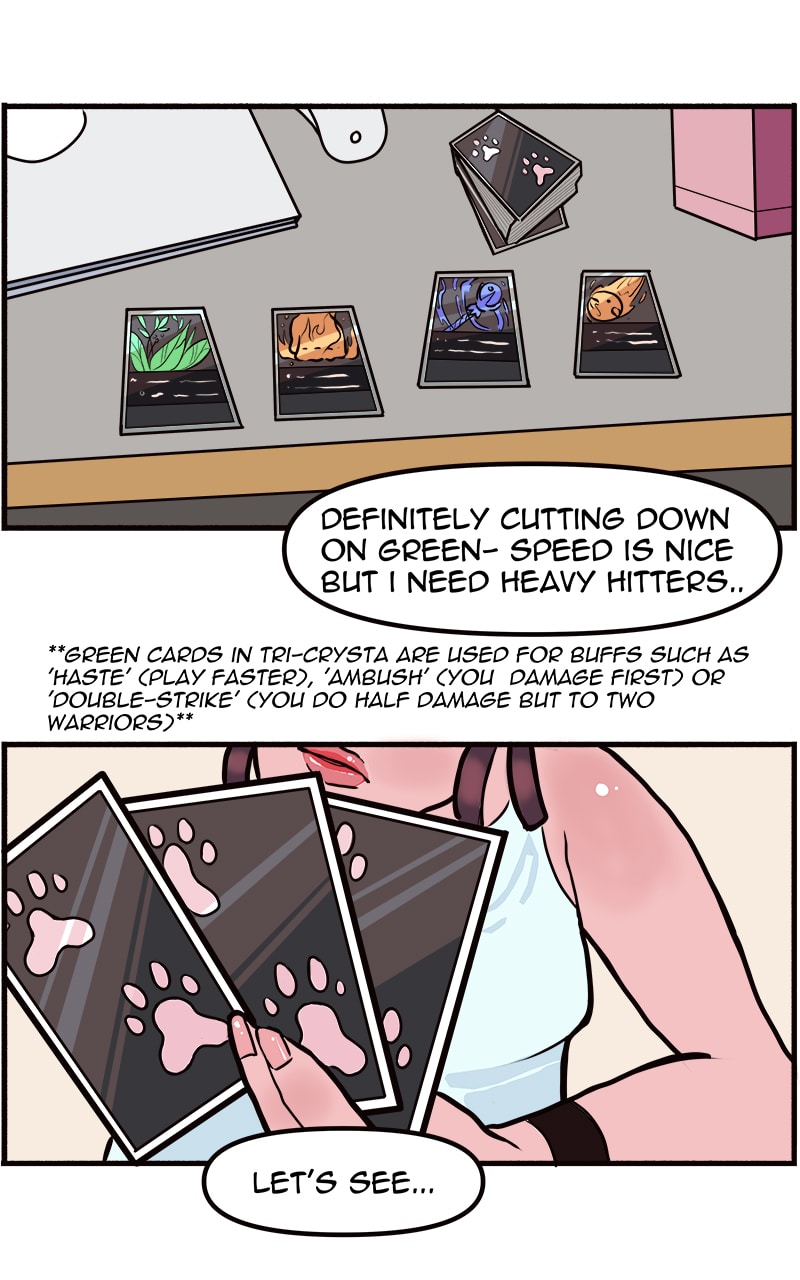 Cards, cats, and corporate life. Mira's daily life is a balancing act, and one she dances well. When the World Championships for the Tri-Crysta Card Game come around however, the scales begin to tip. Can her new friends help her restore the balance, or will she get lost in the shuffle?