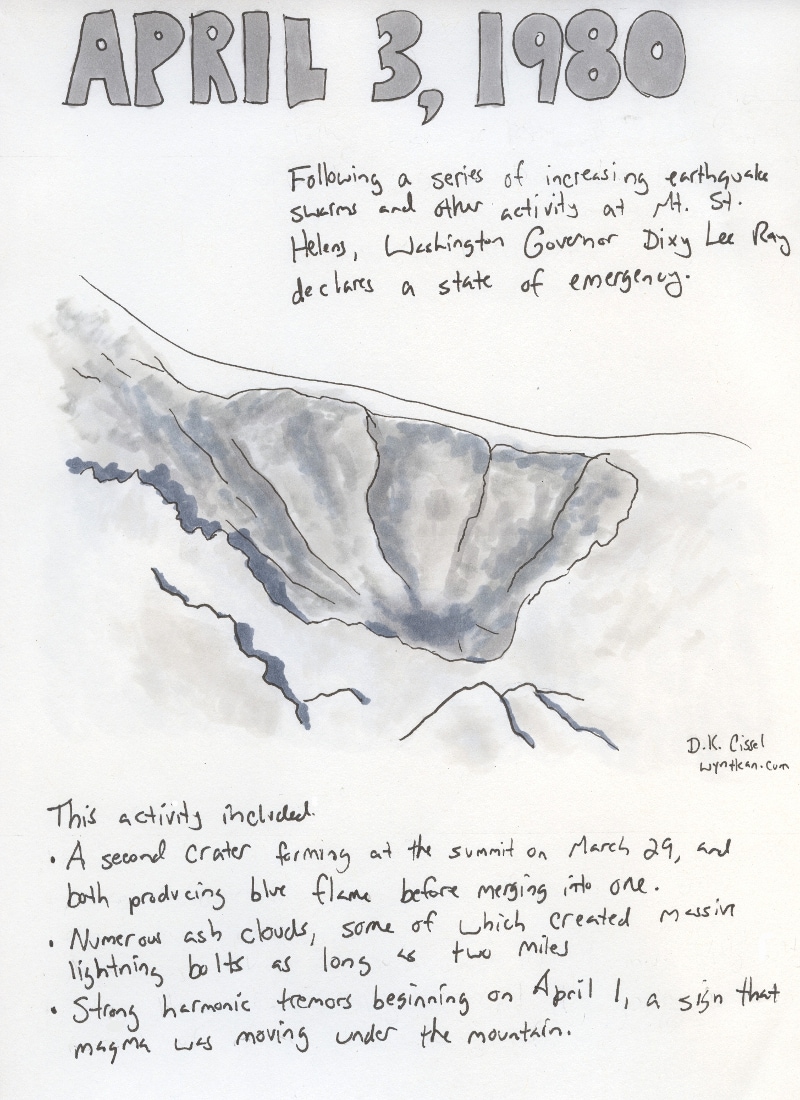 Here’s where the public really began to notice what was going on. By March 27, Cowlitz County had put up a roadblock on the Spirit Lake Highway, the main road going to Mt. St. Helens from the west. Loggers were allowed through since Weyerhauser was still clearcutting the land out that way; scientists and journalists also had access. Initially even homeowners could sometimes talk their way in, though this would change as the danger grew more apparent. The roadblock was meant to keep out sightseers, but many wound their way through back roads and logging roads. Moreover, the roadblock was moved several times; if it was moved further away from the mountain for safety and to cut off access to some of the side routes, business owners would complain, and so it would be moved back.