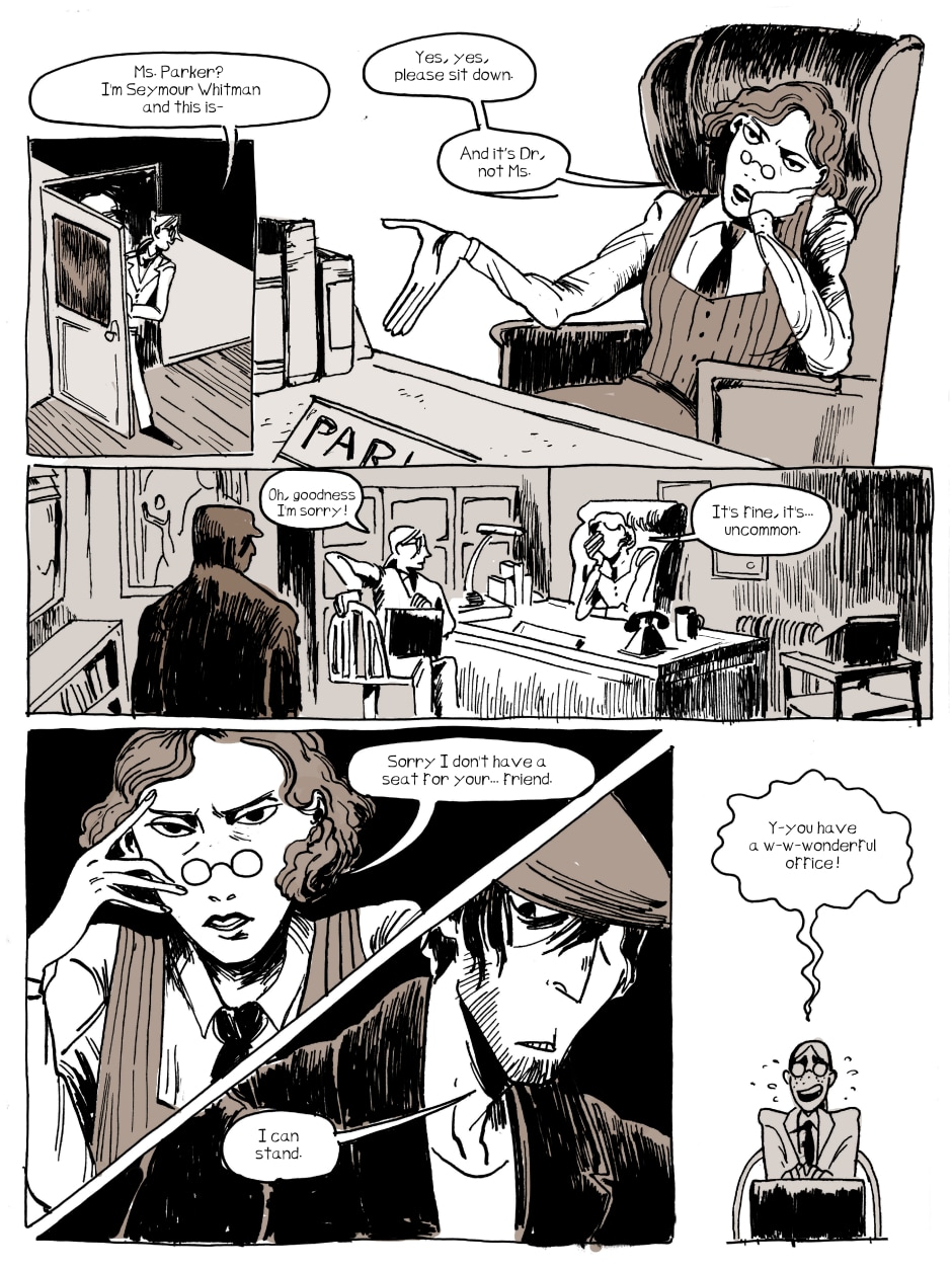 Kingfisher is an 1920s occult mystery series about wannabe scholar Seymour and his friend/roommate/bodyguard Gabriel trying to survive in a strange city while deciphering the secrets of an even stranger puzzle, the Kingfisher Box. Together, they hunt thieves, dodge the police, and look too close into the unknown while navigating their relationship with each other.