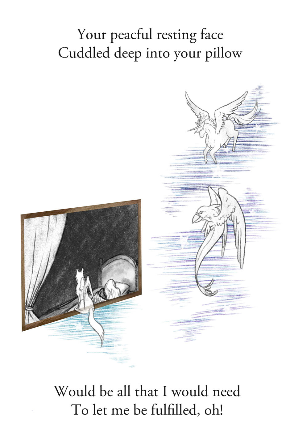 Your peaceful resting face Cuddled deep into your pillow Would be all that I would need To let me be fulfilled, oh!