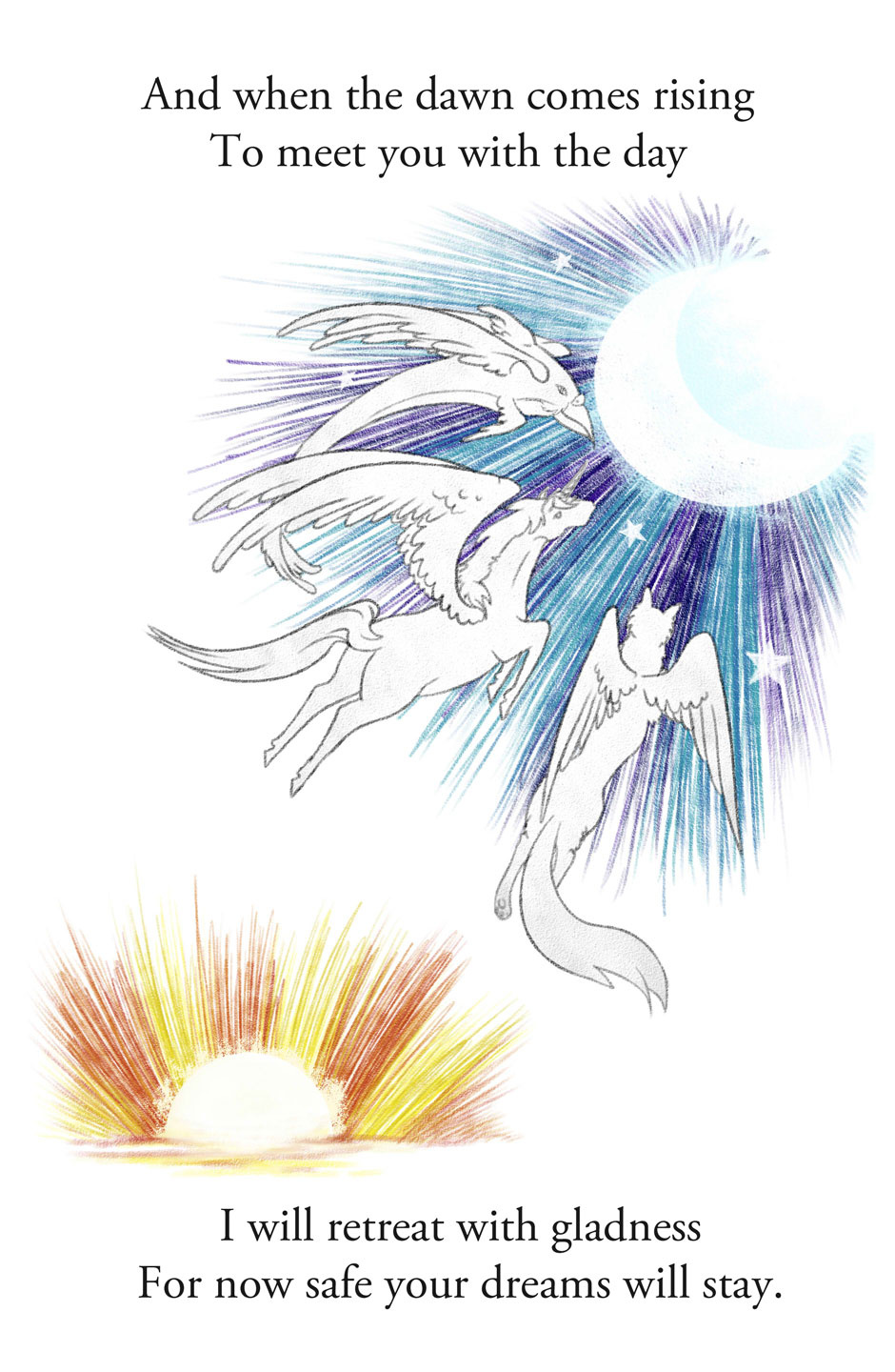 And when the dawn comes rising To meet you with the day I will retreat with gladness For now safe your dreams will stay.