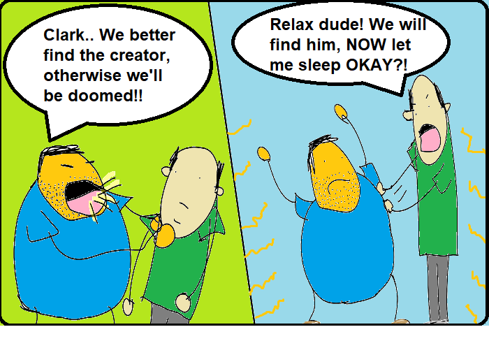 Two dudes named Clark and Meslick who both are living a boring life, and Clark who is a very lazy stubborn and curious, he wants to find out why his Creator God made him so imperfect and asymmetrical. Therefore, him and Clark decide to go on an adventure together to meet their creator. But they may encounter strange things as they are on their way and it could get risky.. Check out my Insta: