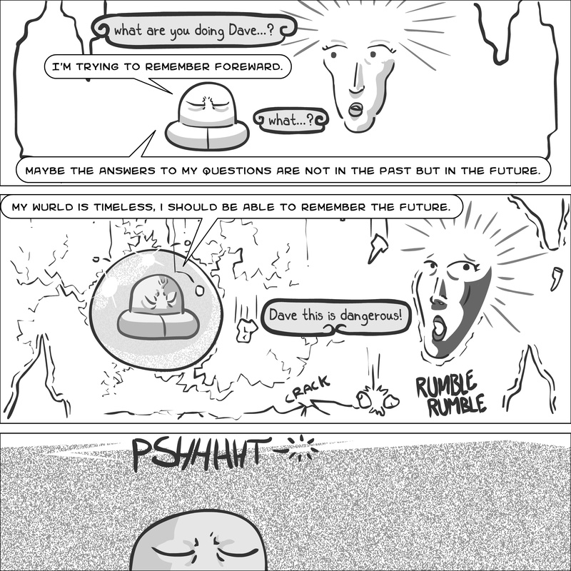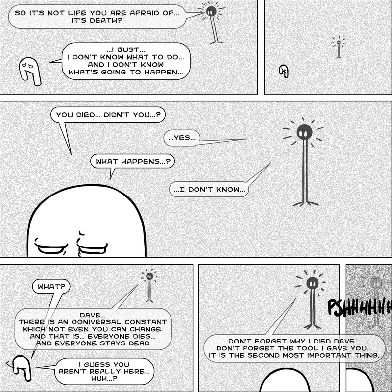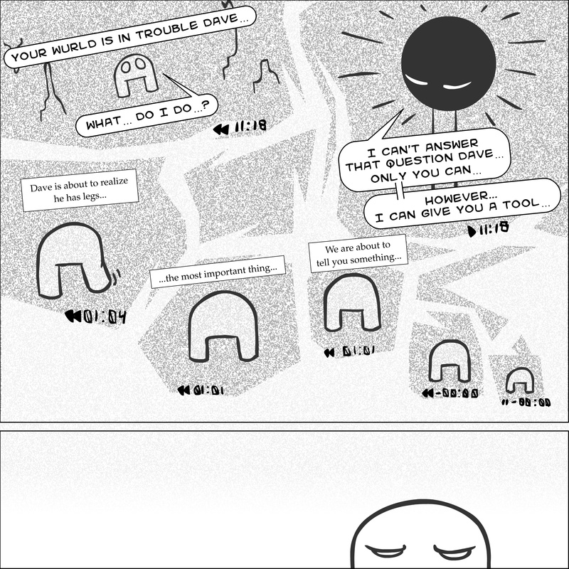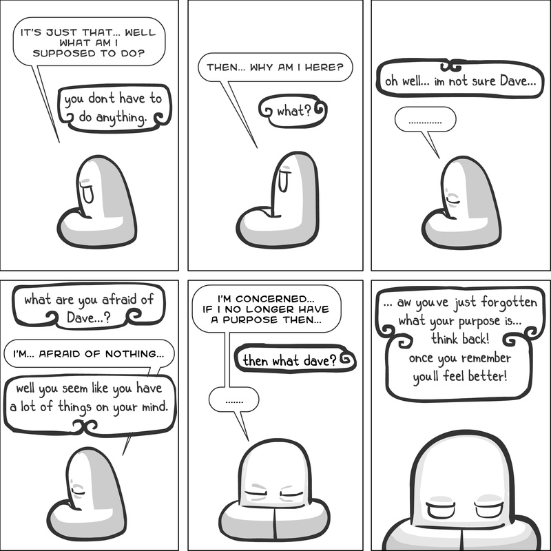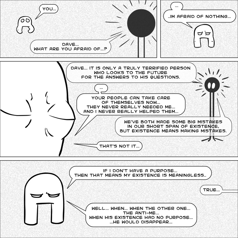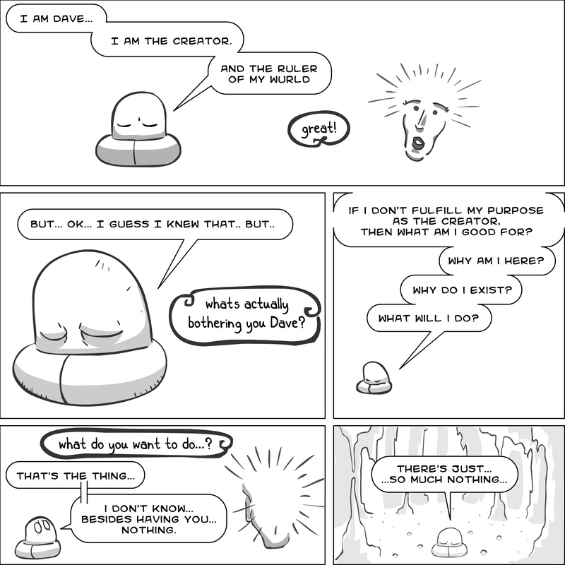 Dave's Wurld is a completed series about a child-like being living in an empty wurld. Dave has just discovered he has legs, and already he is on a journey of discovery, first to seek a shiny object which may or may not exist, and then to seek his purpose. Dave's Wurld has humble beginnings, but a simple act from Dave explodes into a universe of people and places, as well as Dave's rival, Anti-Dave. Dave will learn what it means to be worshiped by his people, loved and indeed hated, but will he learn responsibility? the fate of his wurld may depend on it.