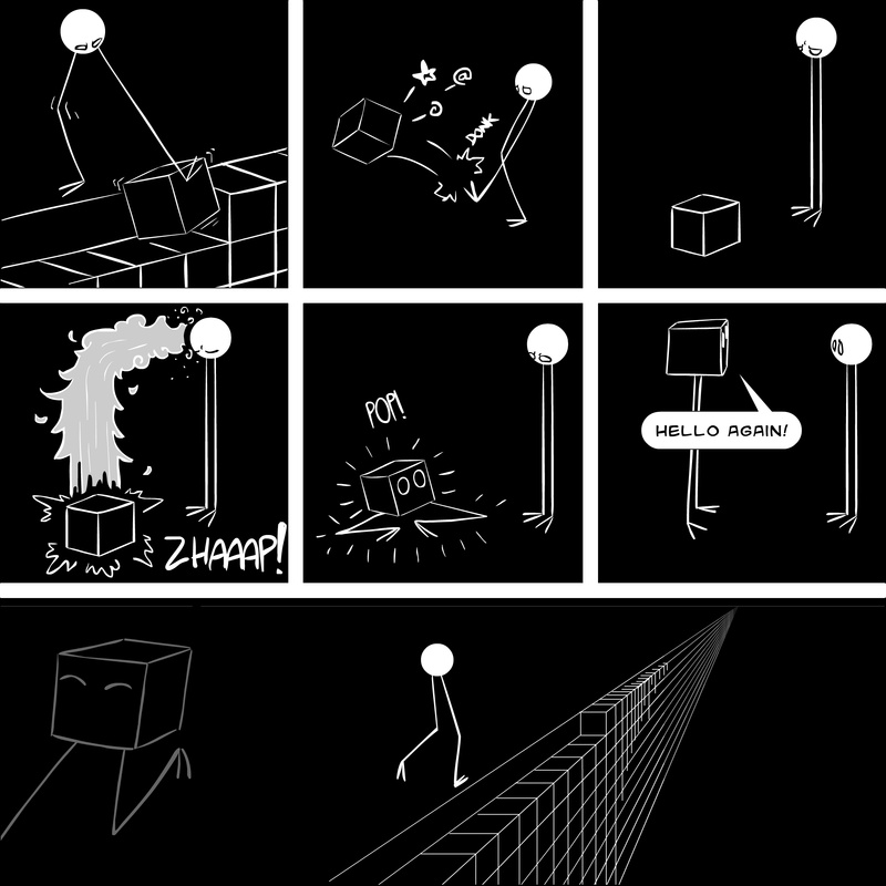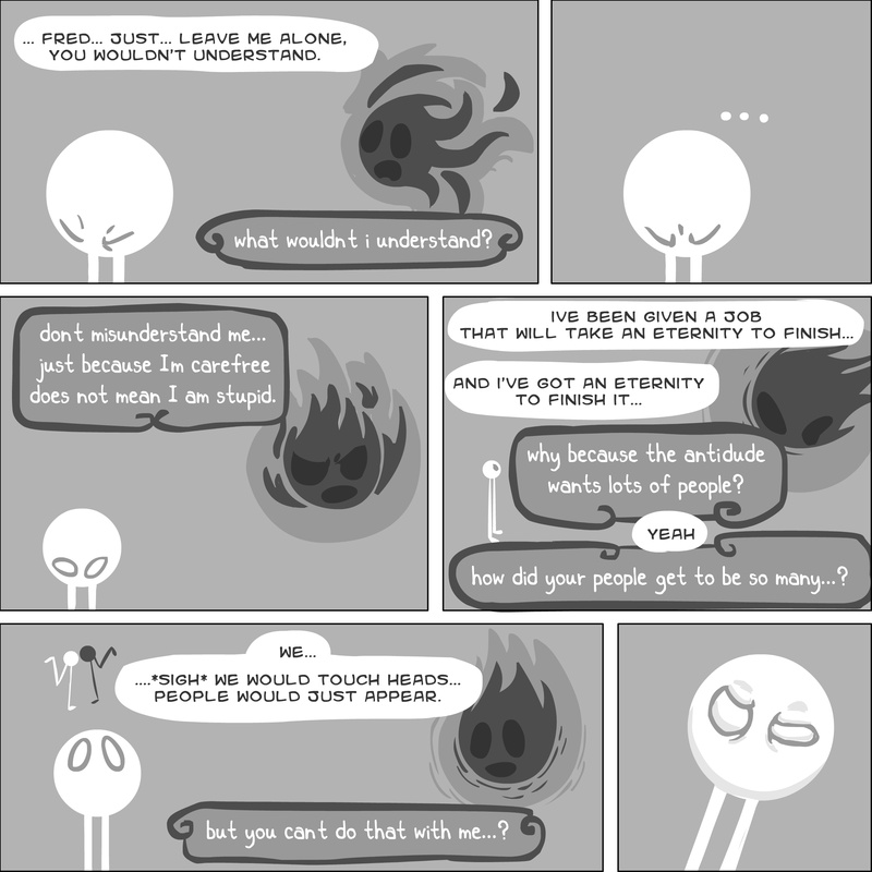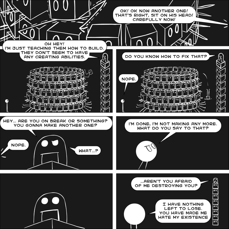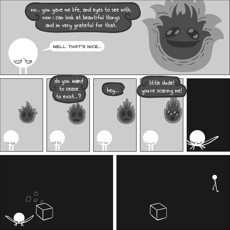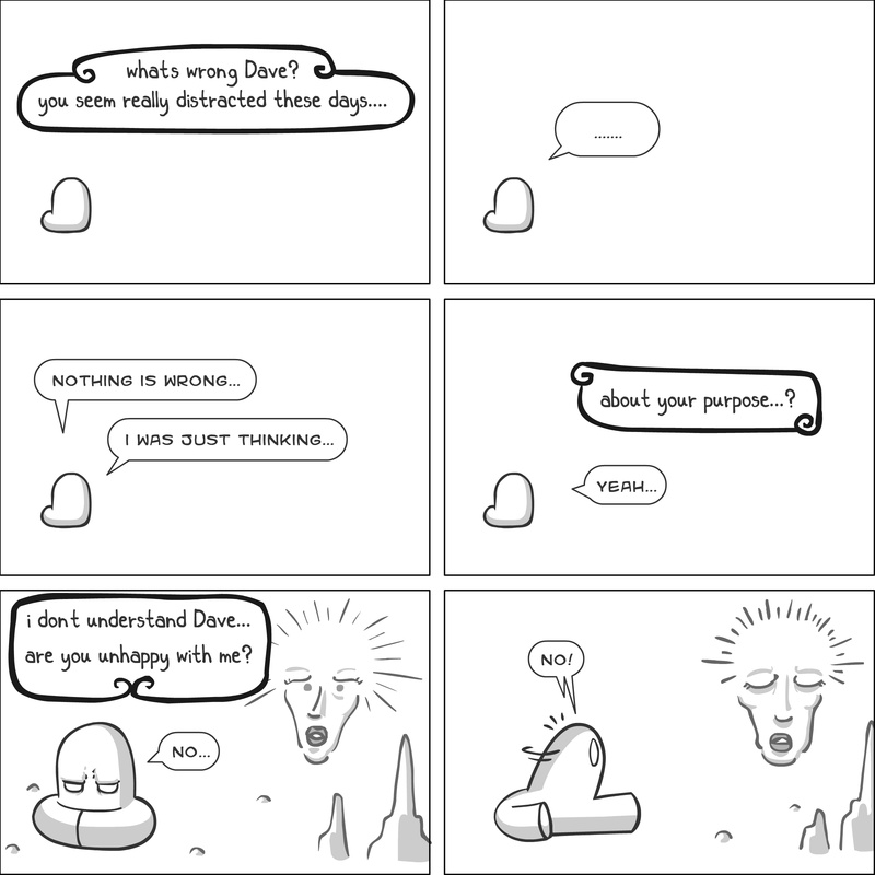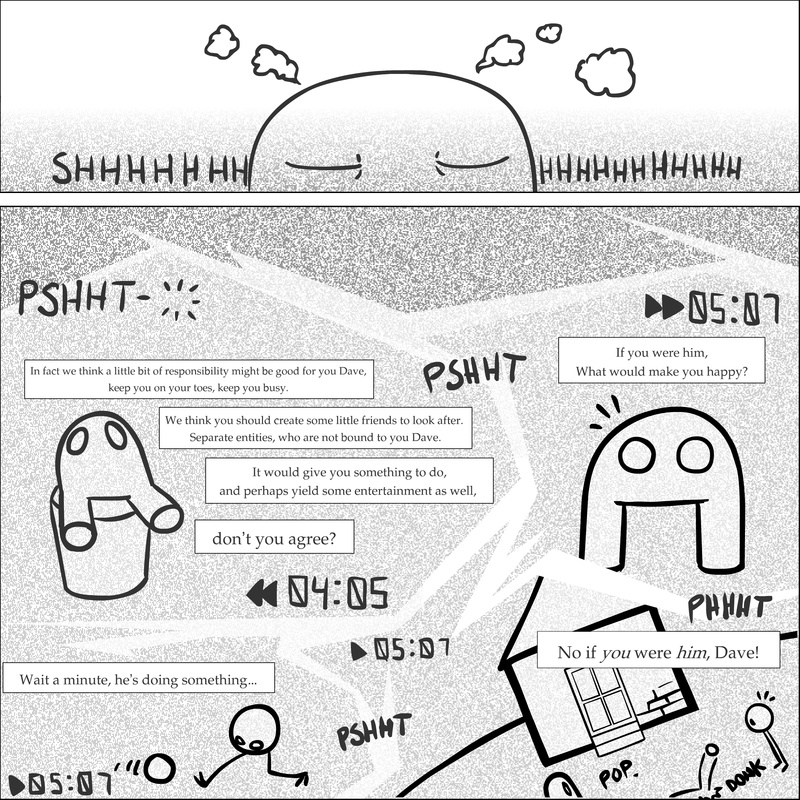 Dave's Wurld is a completed series about a child-like being living in an empty wurld. Dave has just discovered he has legs, and already he is on a journey of discovery, first to seek a shiny object which may or may not exist, and then to seek his purpose. Dave's Wurld has humble beginnings, but a simple act from Dave explodes into a universe of people and places, as well as Dave's rival, Anti-Dave. Dave will learn what it means to be worshiped by his people, loved and indeed hated, but will he learn responsibility? the fate of his wurld may depend on it.