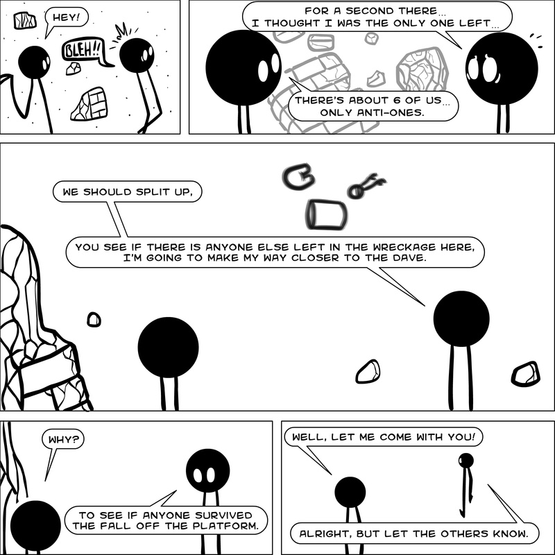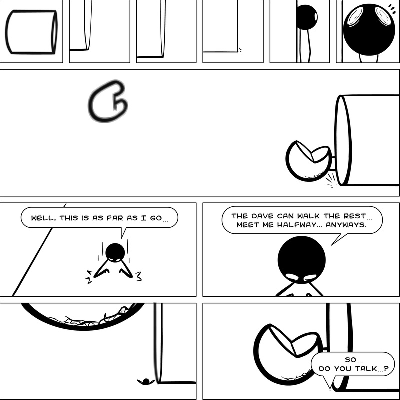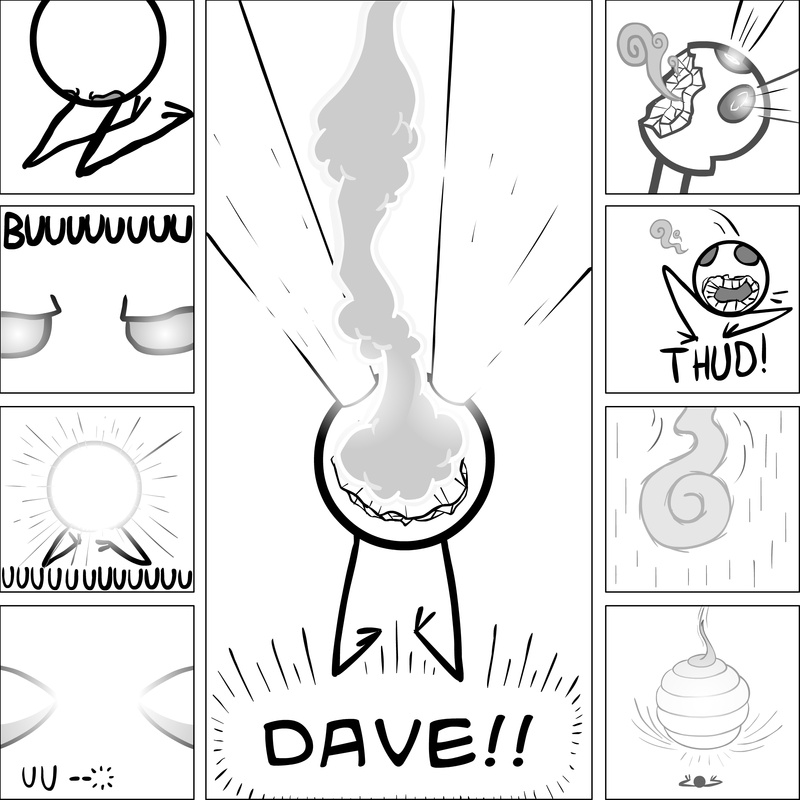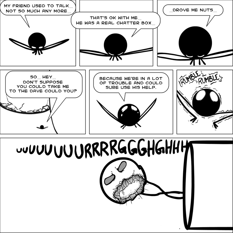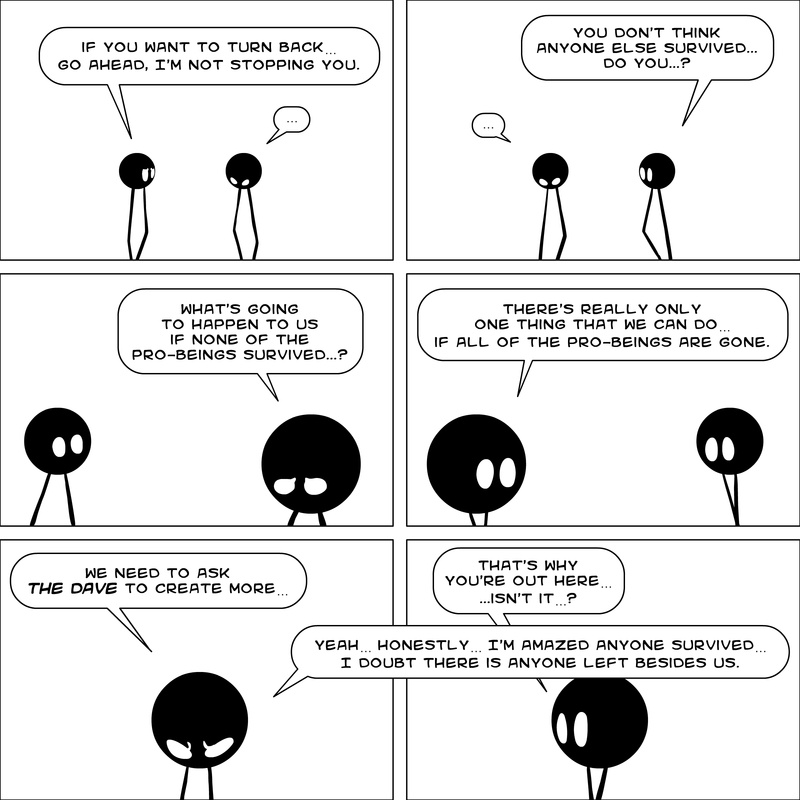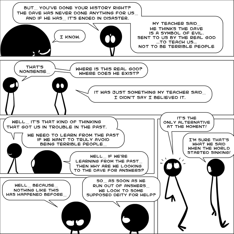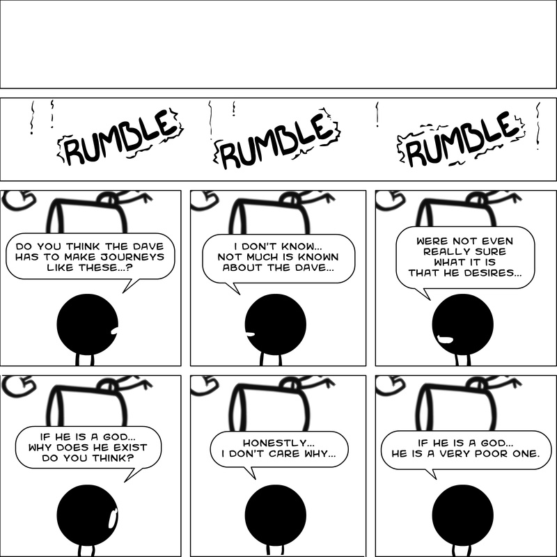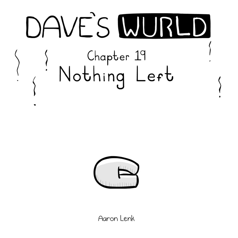 Dave's Wurld is a completed series about a child-like being living in an empty wurld. Dave has just discovered he has legs, and already he is on a journey of discovery, first to seek a shiny object which may or may not exist, and then to seek his purpose. Dave's Wurld has humble beginnings, but a simple act from Dave explodes into a universe of people and places, as well as Dave's rival, Anti-Dave. Dave will learn what it means to be worshiped by his people, loved and indeed hated, but will he learn responsibility? the fate of his wurld may depend on it.