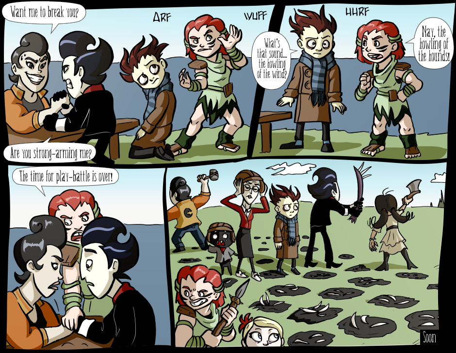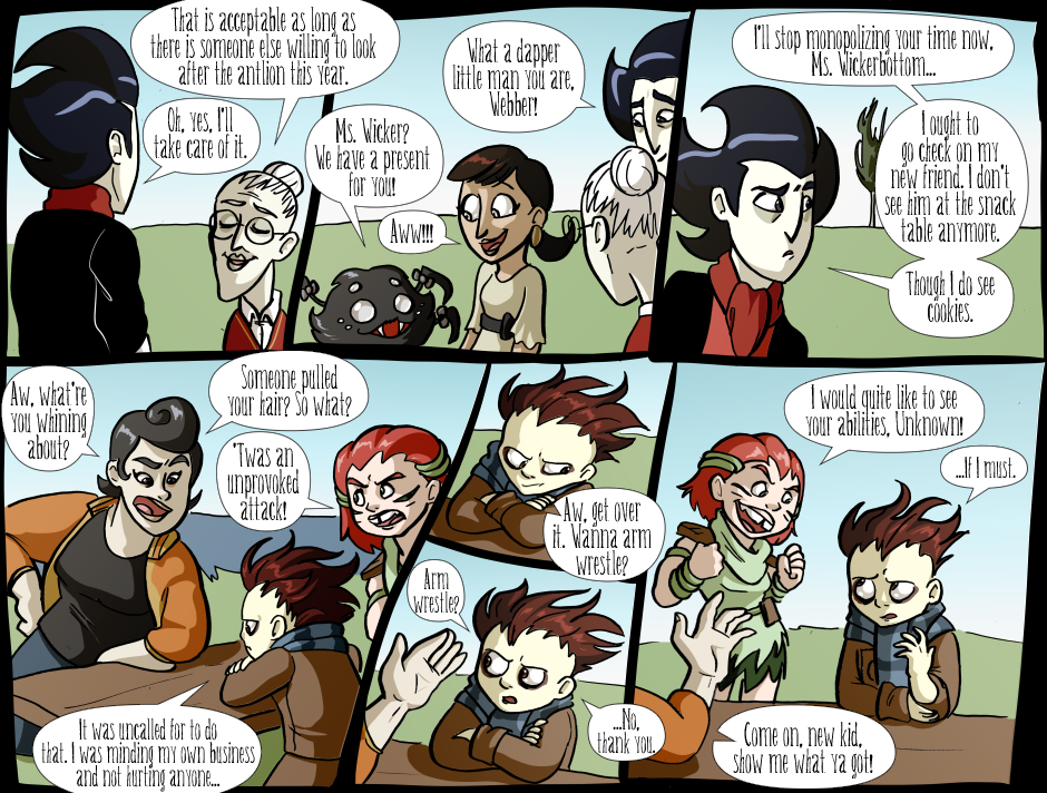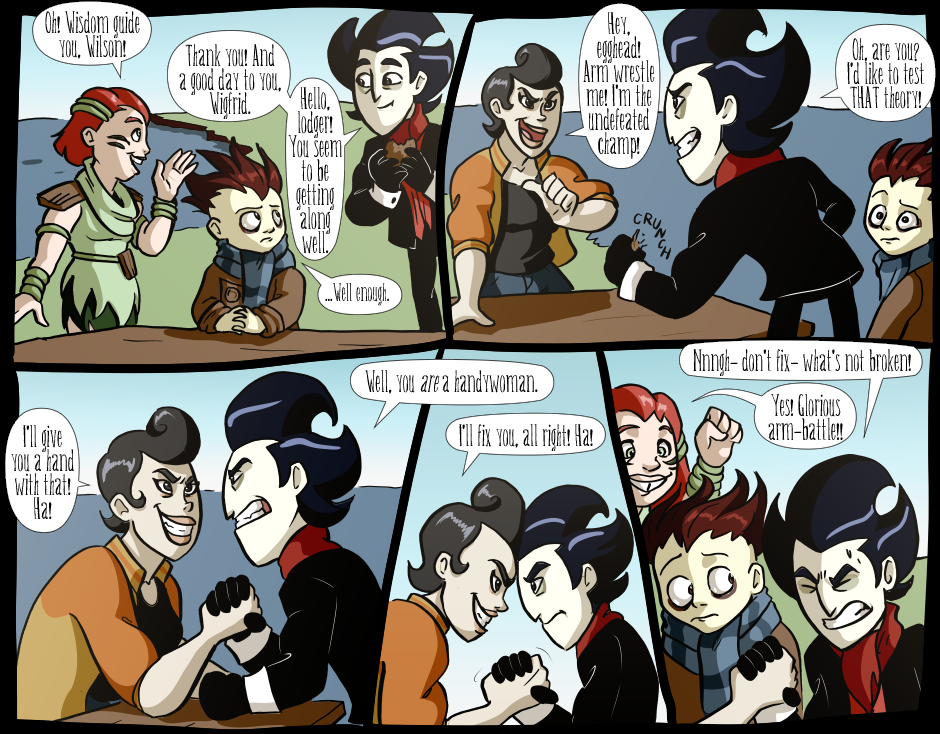 This is a crossover fancomic between Don't Starve Together (Klei Entertainment) and Knock-knock (Ice-pick Lodge). On a dark and stormy night, a mysterious, mumbling stranger turns up in the Constant, and he brought along all of his emotional baggage. DISCONTINUED.