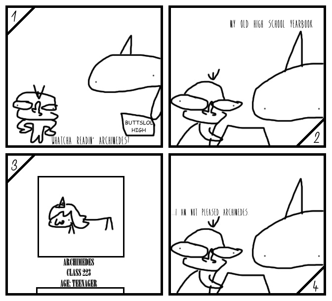 Archimedes and his pal look at his yearbook photo.