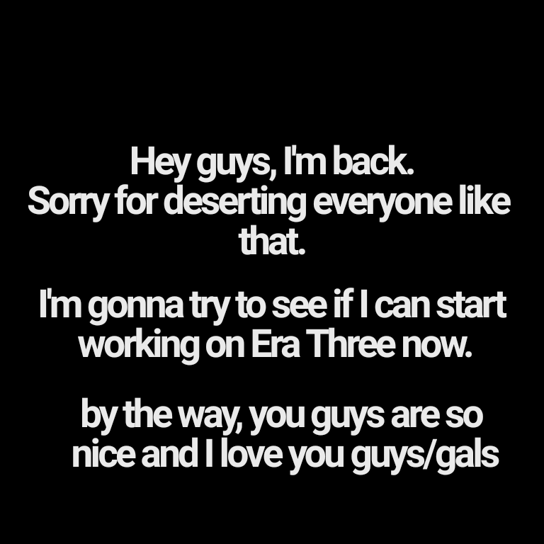 Also posting here cause I feel like I have to. Yes, I am back. I have big plans I wanna make to this account. One of them is probably getting rid of all my fan comics and starting them on a different account, but I'll let you guys decide!