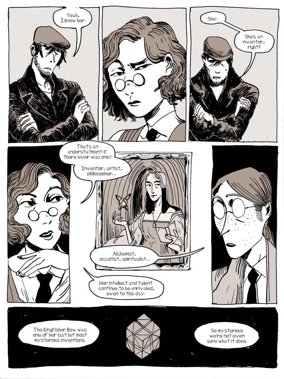 Kingfisher is an 1920s occult mystery series about wannabe scholar Seymour and his friend/roommate/bodyguard Gabriel trying to survive in a strange city while deciphering the secrets of an even stranger puzzle, the Kingfisher Box. Together, they hunt thieves, dodge the police, and look too close into the unknown while navigating their relationship with each other.
