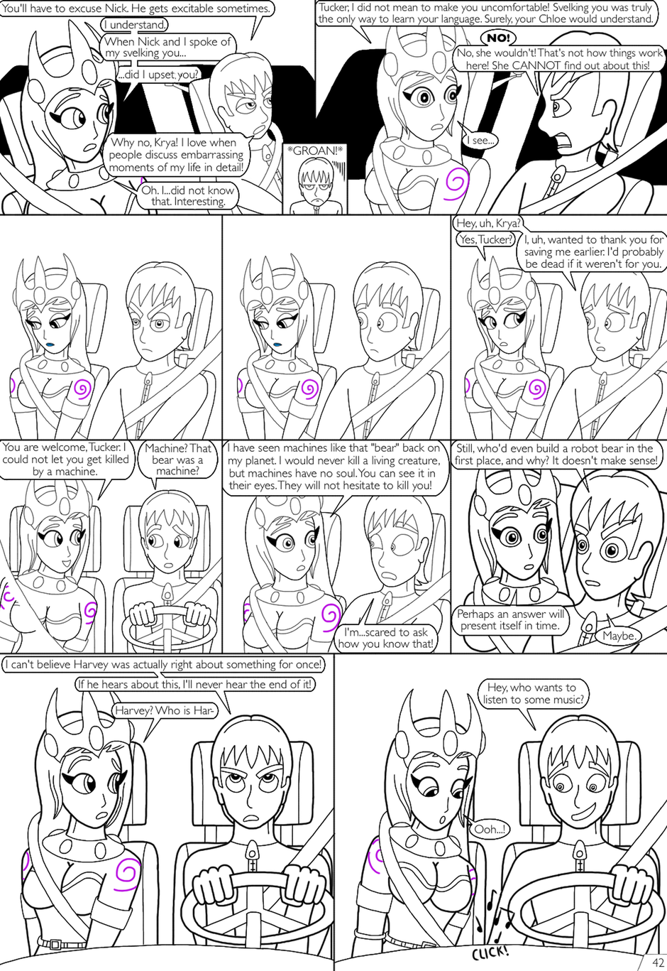 Tucker brings Krya back to the city as she asks, as they introduce each other and exchange notes.