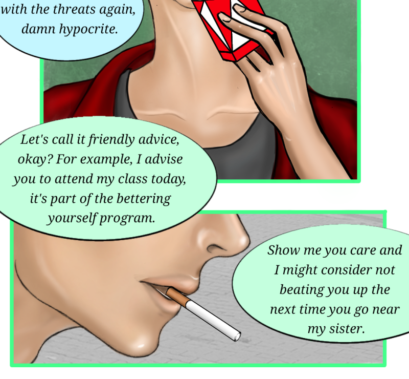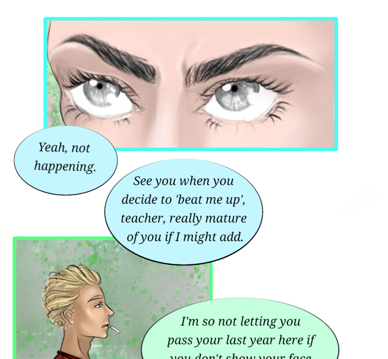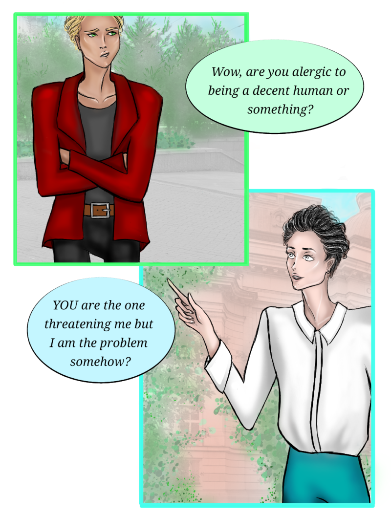 Connor: I'm gonna beat you up. Nikola: Wow, you're an asshole. Connor: *visible surprise* Jk, they're both pretty unfriendly so far, but I promise it gets better. :D