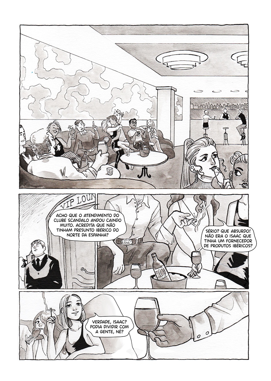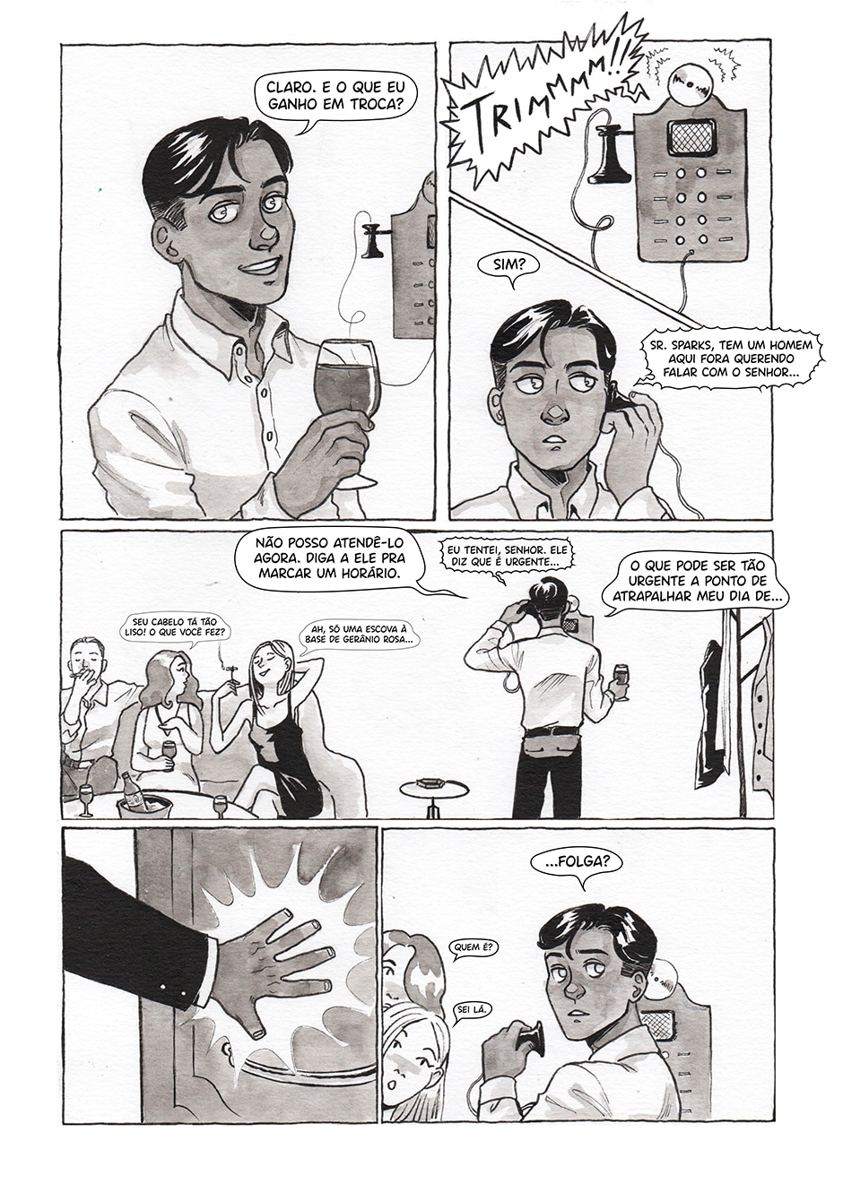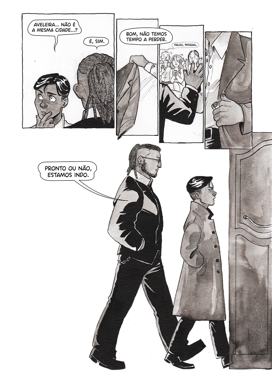 Adorei a última página! Com eles saindo pela porta, os painéis pequenos dele pegando o casado e Isaac saindo pela porta com o segurança (que parece um personagem super legal) ficou bem bonito! Parabéns!