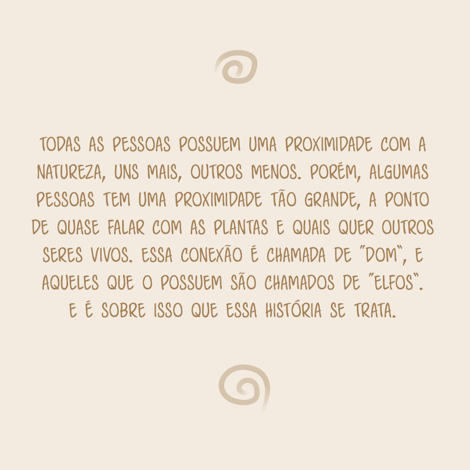 Todas as pessoas possuem certa proximidade com a natureza, uns mais, outros menos. Porém, algumas pessoas têm uma proximidade tão grande que quase podem falar com as plantas e quaisquer outros seres vivos. Essa conexão é chamada de "Dom" e aqueles que possuem são chamados de "elfos". E é sobre isso que essa história se trata.