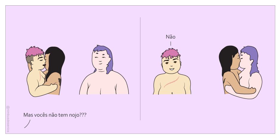 O contato físico entre mais de dois indivíduos é um tabu que provoca nojo em muitos, porém tendo os cuidados com infecções transmissíveis não há problema algum. Também é possível notar que duas das personagens aqui já foram mencionadas como amigas e nesta tira estão se beijando. Elas possuem uma amizade colorida, ou seja, uma amizade onde ocorre o contato sexual ocasional, sem necessidade de um relacionamento romântico.