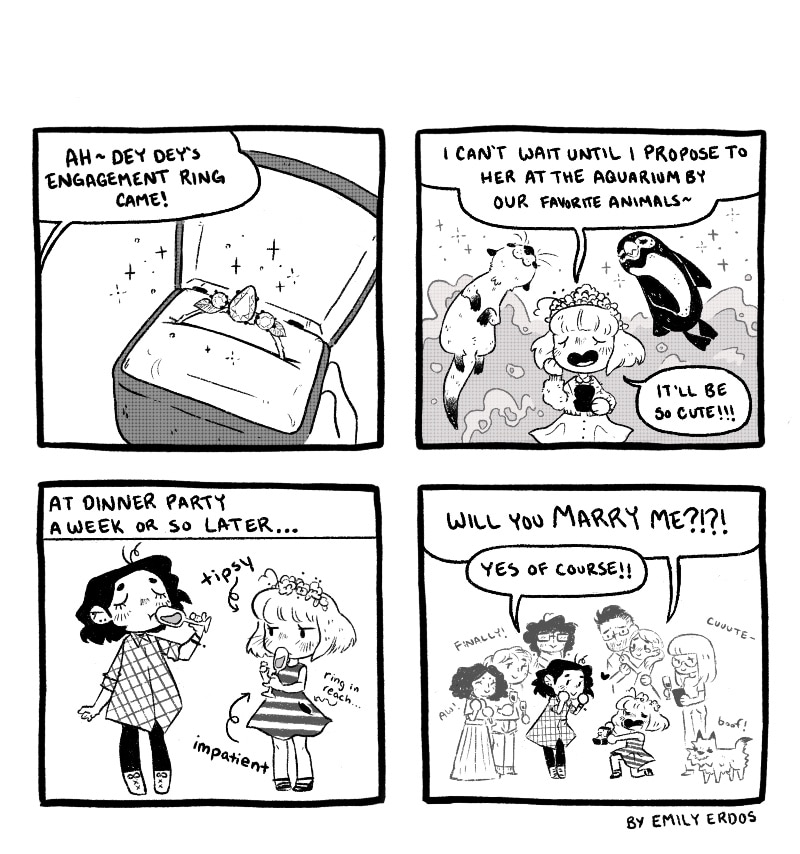 Hope y’all don’t mind Emily doing some guest comics while I’m swamped with other projects! She really wanted to let everyone know she proposed first lol If you’re missing my comics be aware I post a Patreon exclusive comic every month ;)