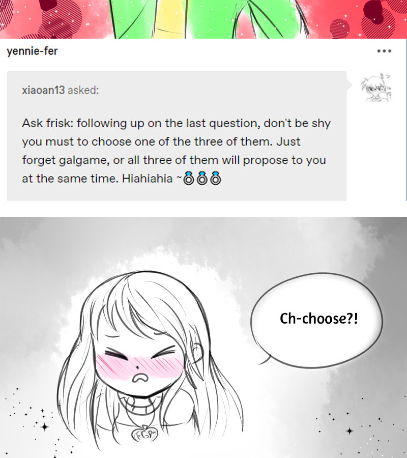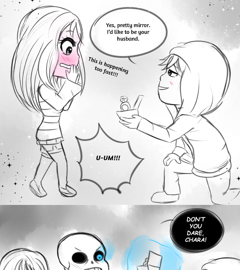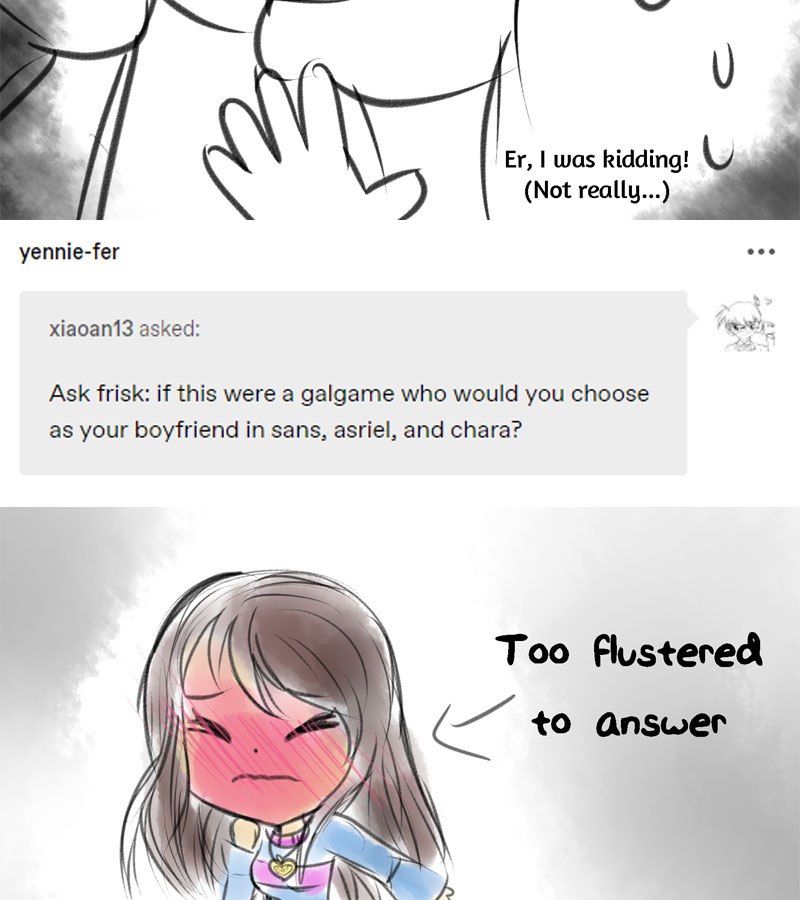 Frisk finds herself in an unfamiliar timeline. She runs into dangers on the way. Within her dangers, she meets Sans, Chara and Asriel. There are many confusions and differences she comes across in this timeline. Can Frisk ever save her timeline again? THIS STORY PERTAINS A LOVE SQUARE, but only one shall prevail. Has other Undertale AUs in it, but with our own artistic flair to it. Updates: BIWEEKLY