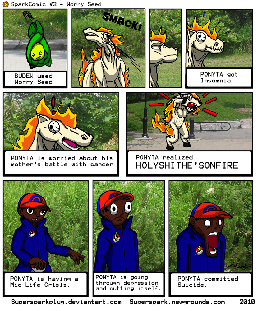 I was playing Pokemon Platinum a while back and one of the Wild Budew used the move "Worry Seed" on my Ponyta, giving it insomnia. It striked me as an odd name and feature for an attack. It's called Worry Seed so it has to make you worry about something... And then this idea came to me.
