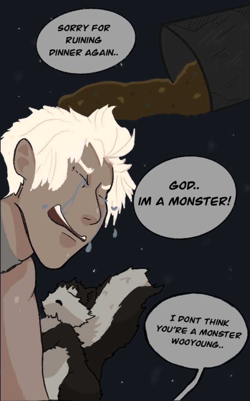 Coughing up the slick, sick taste of dread as my eyes roll back into my head. I feel numb as it controls me. Dare i stay here as i cannot control what lies Within me. Banished from society, Wooyoung lives alone in the woods after deemed too dangerous for humanity. But when visited by a unknown woman in the middle of the night, his life changed forever.