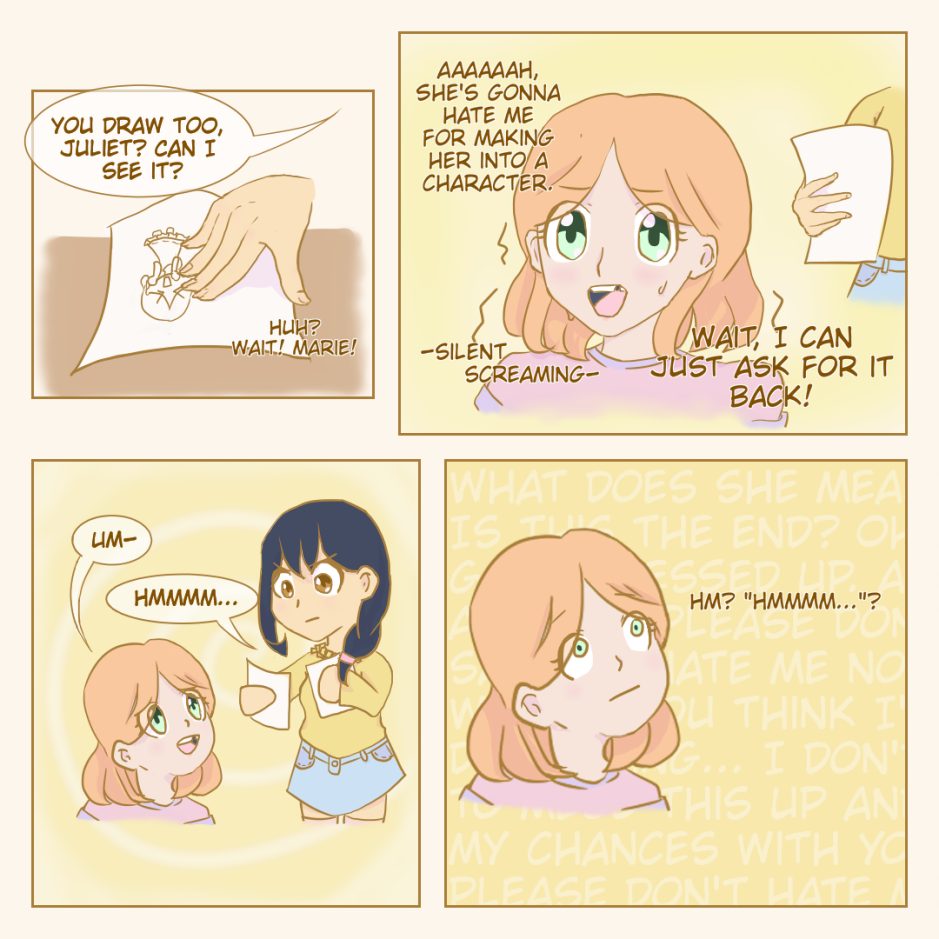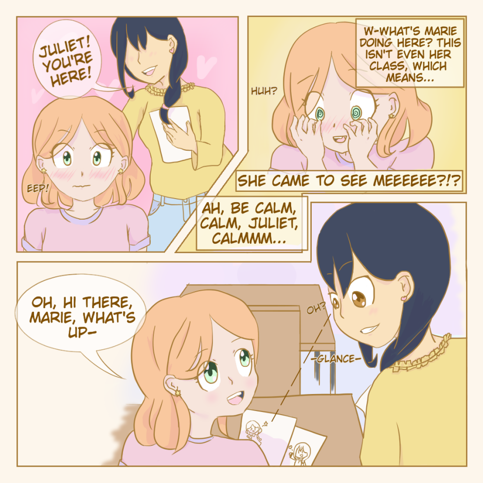 Juliet is one of the school's best athletes and one of the smartest. She's popular and easily gathers a crowd but is completely oblivious to it. Marie is more in love with reading stories than reading math problems but just about all her grades but English are tanking. She usually has Artemis to help her out, but recently felt Artemis becoming colder to her despite being friends since kindergarten.